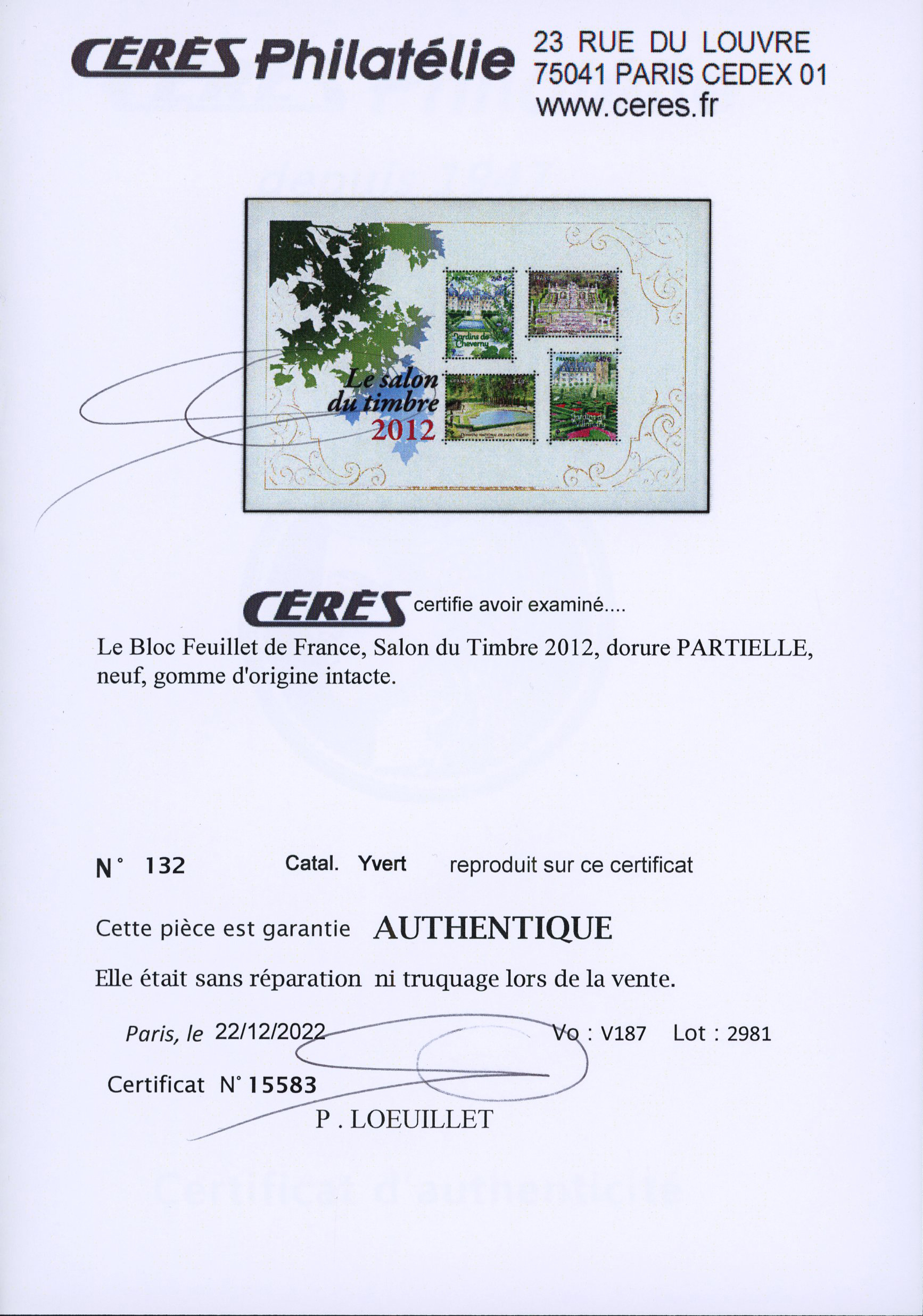 2012, bloc- feuillet du Salon du timbre 2012 spectaculaire variété dorure partielle bloc neuf ** MNH, TB et certificat Cérès. (Image 1)