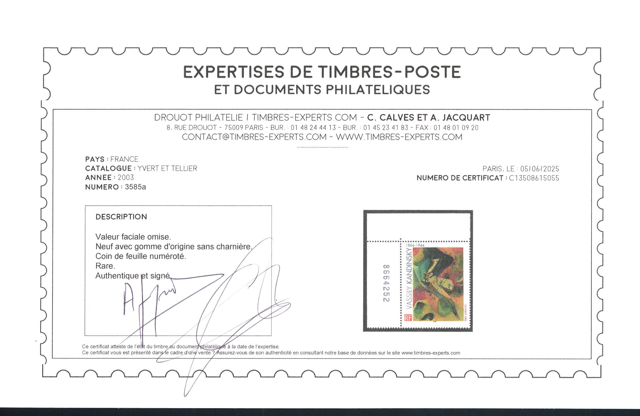 2003, variété KANDINSKY n°3585a valeur faciale omise neuf** TB signé Calves et certificat Calves (2025). Cote 5'000€. (Image 1)