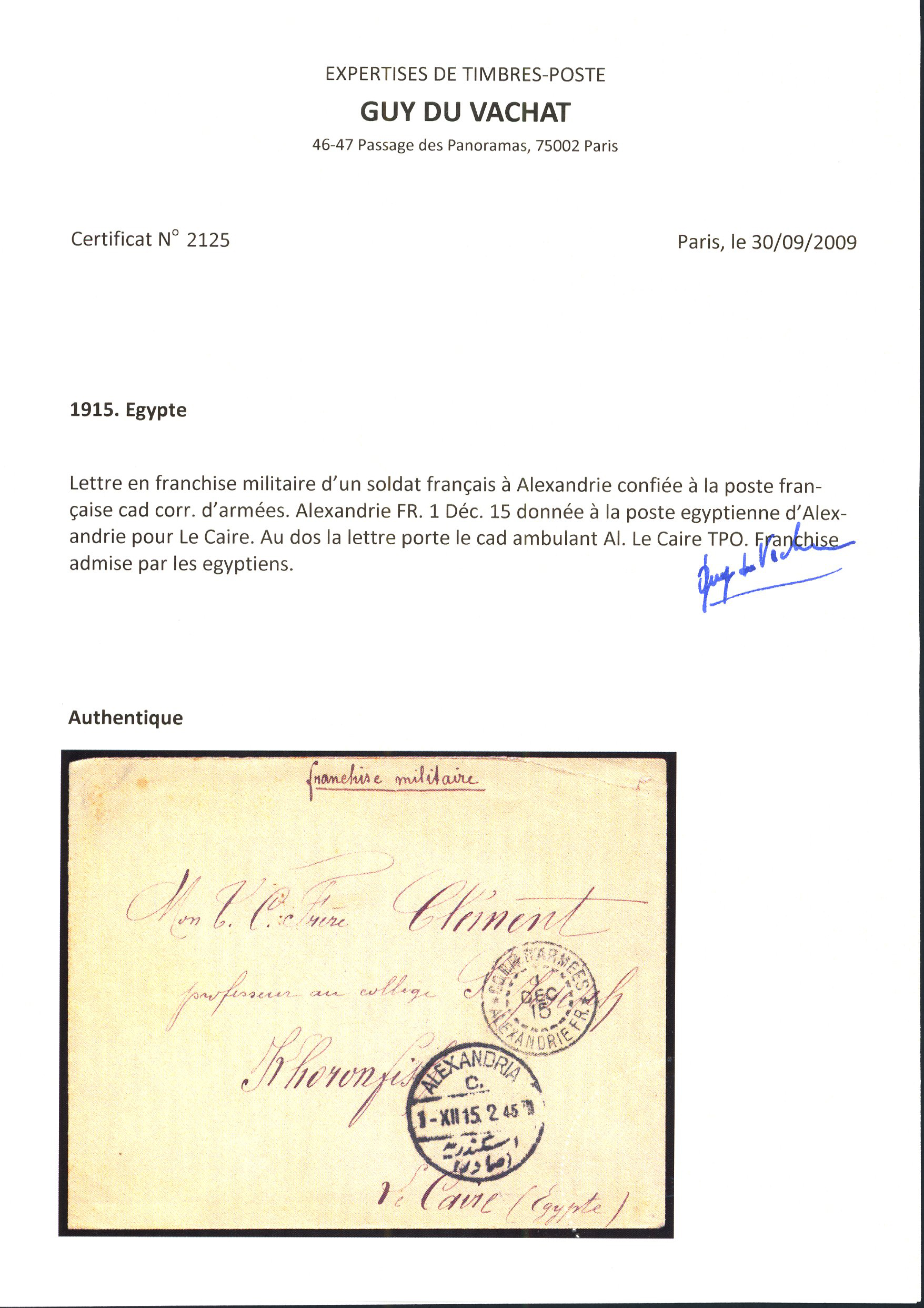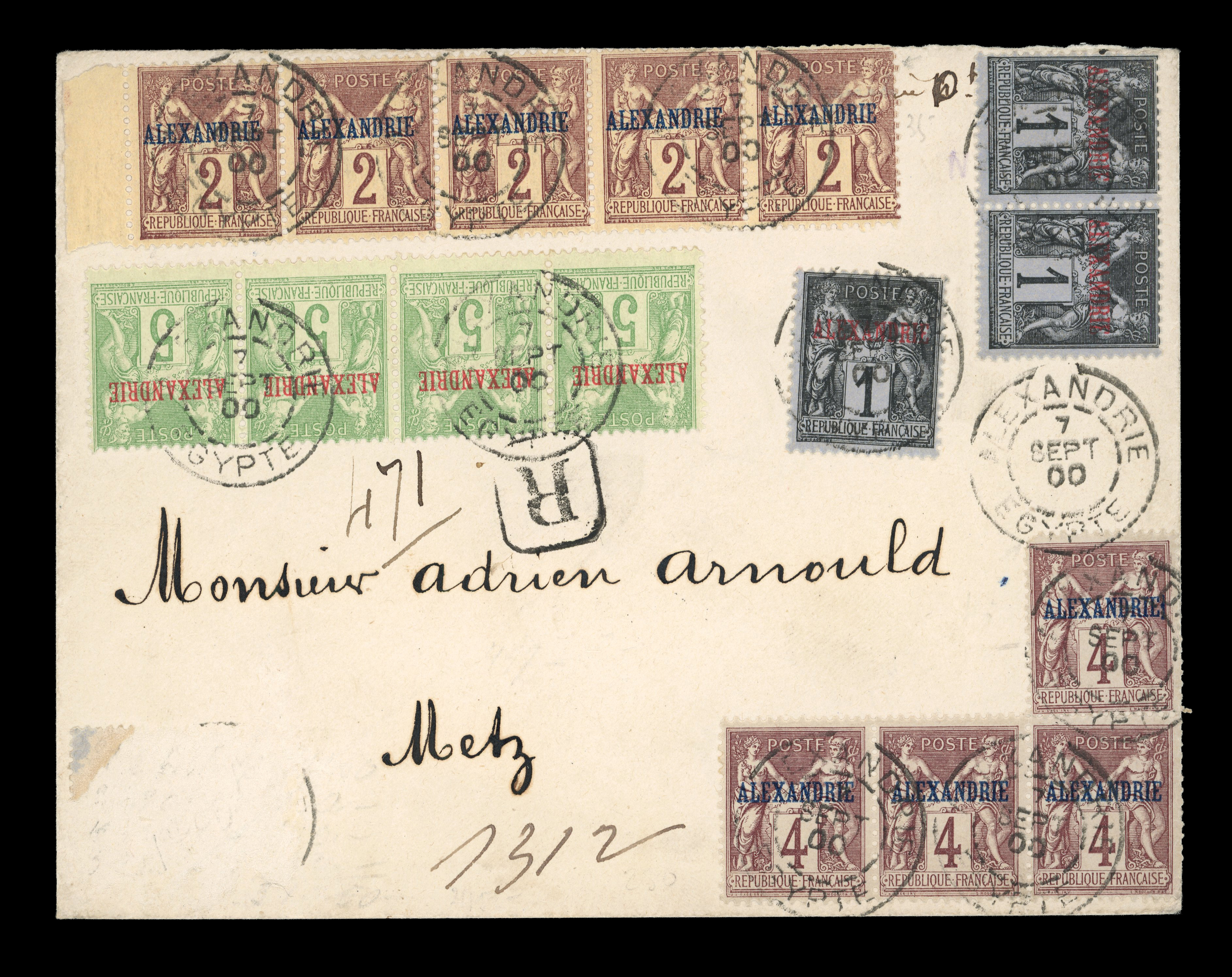 20769 O,   imagePetit lot de 5 lettres et 2 cartes postales des Colonies françaises dont 1 EXCEPTIONNEL affranchissement composé de 16 timbres d'ALEXANDRIE pour Metz (Moselle). Également à considérer une lettre en franchise militaire pour un militaire français à Alexandrie confiée à la poste française. D'autres belles choses. À voir. (Image 1) (Image 2) (Image 3) (Image 4)
