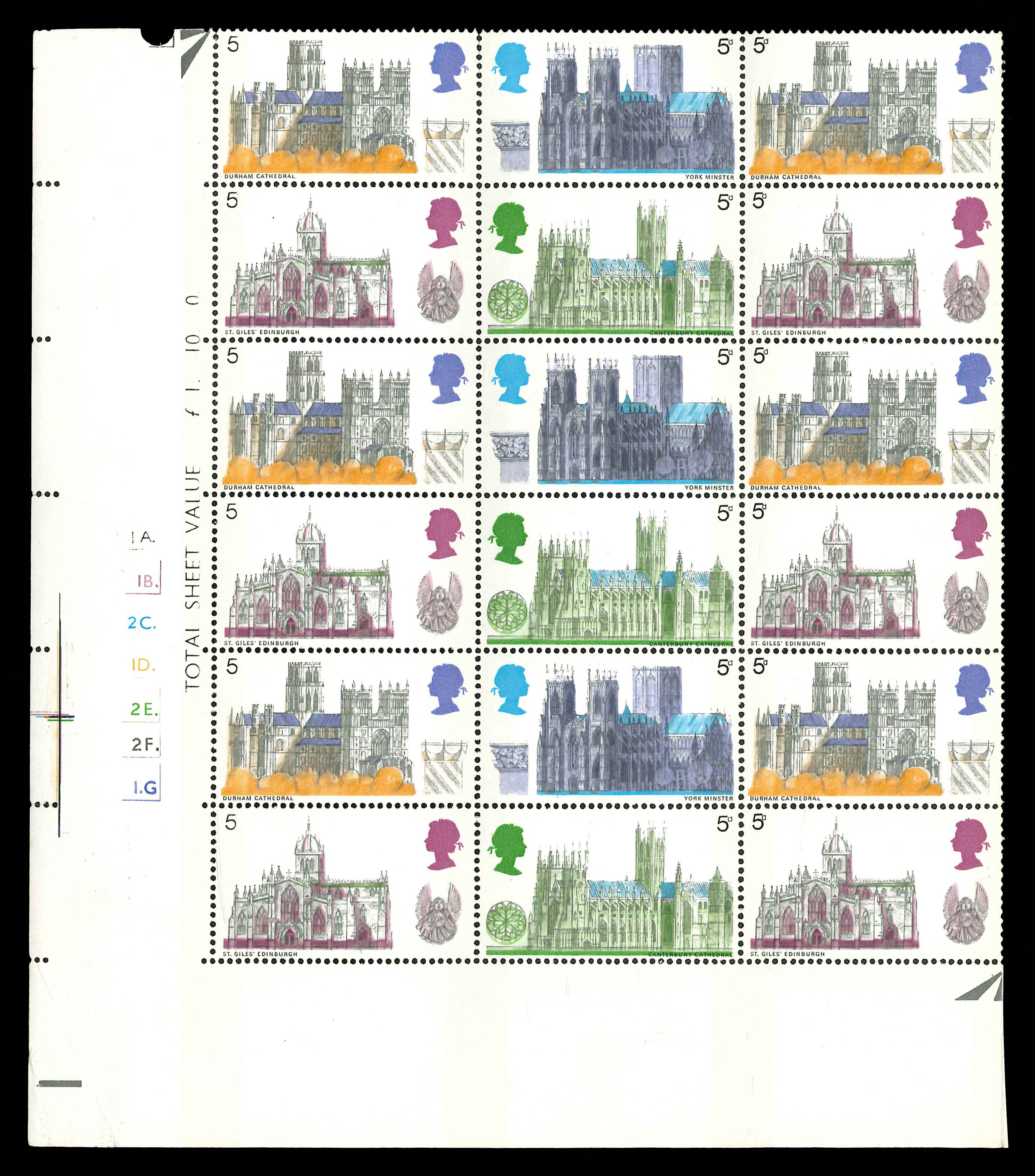 1969 Cathedrals 5d lower left corner marginal cylinder block of 18, with the first column showing the missing "d" variety, mint n.h., very fine and fresh (S.G. Spec. W159d and W161d, £3'300+). (Image 1)