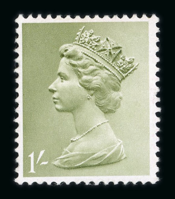1971 Harrison & Son colour trials, 1s in pale olive green, unadopted colour, on OCP/PVA paper, mint h.r., pencil "X" annotation on reverse, very fine, very rare, only two examples thought to exist. (Image 1)