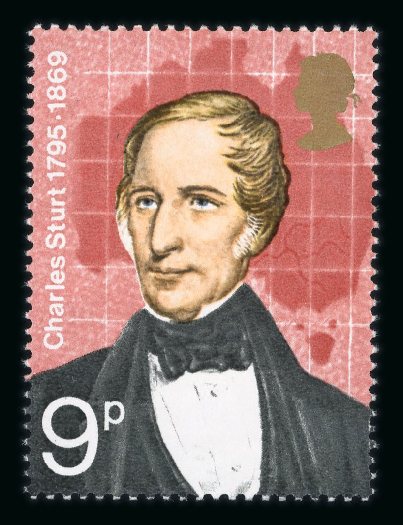 1973 Explorers 9p Charles Sturt mint n.h. with gold omitted in lower right traffic light corner vertical pair, very fine, incl. matching normal traffic light corner pair (S.G. Concise 2025 £450+). (Image 1)