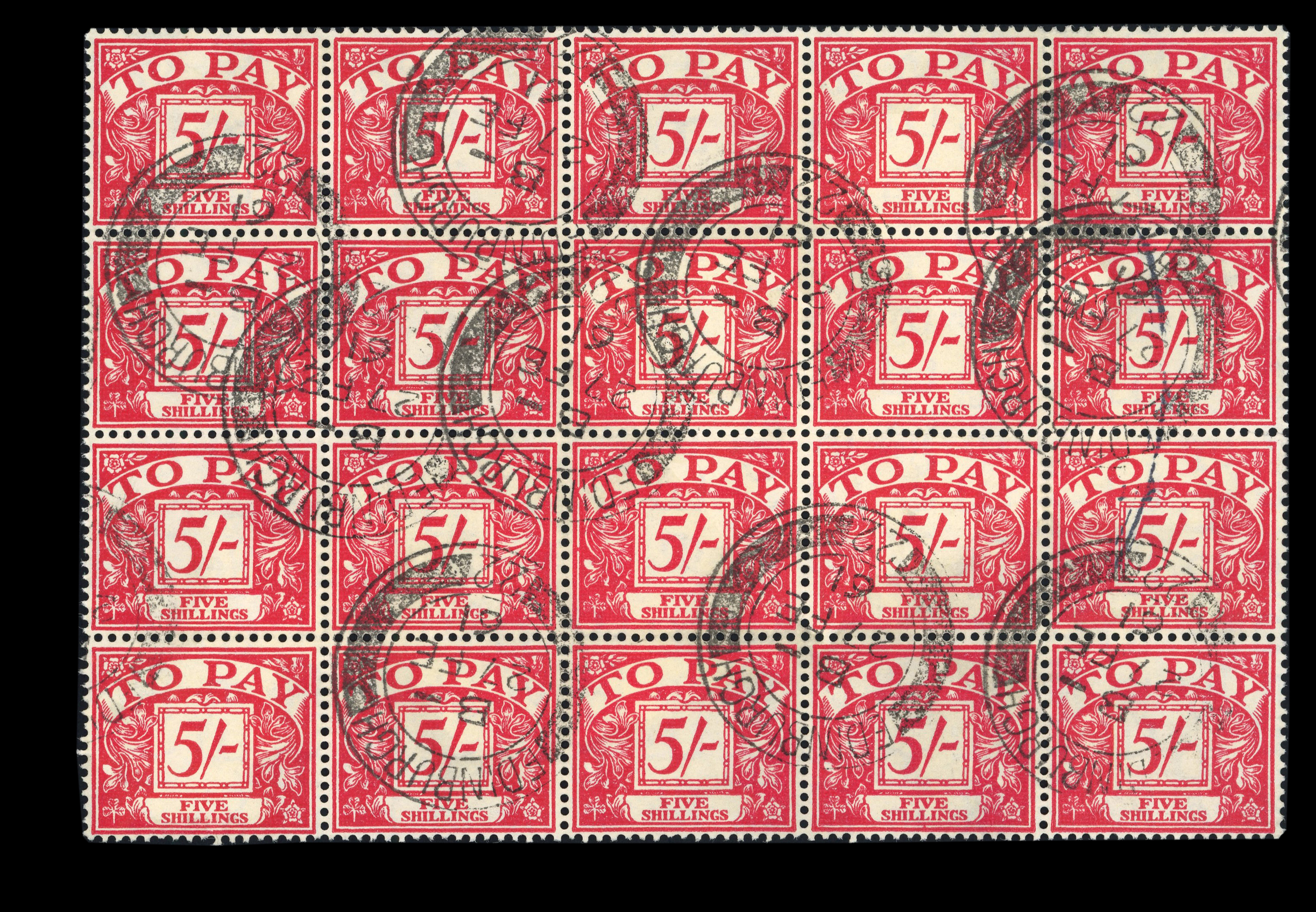 1955-57 5/- fine used block of twenty (5 x 4) SG D55 cat.£640. (Image 1)