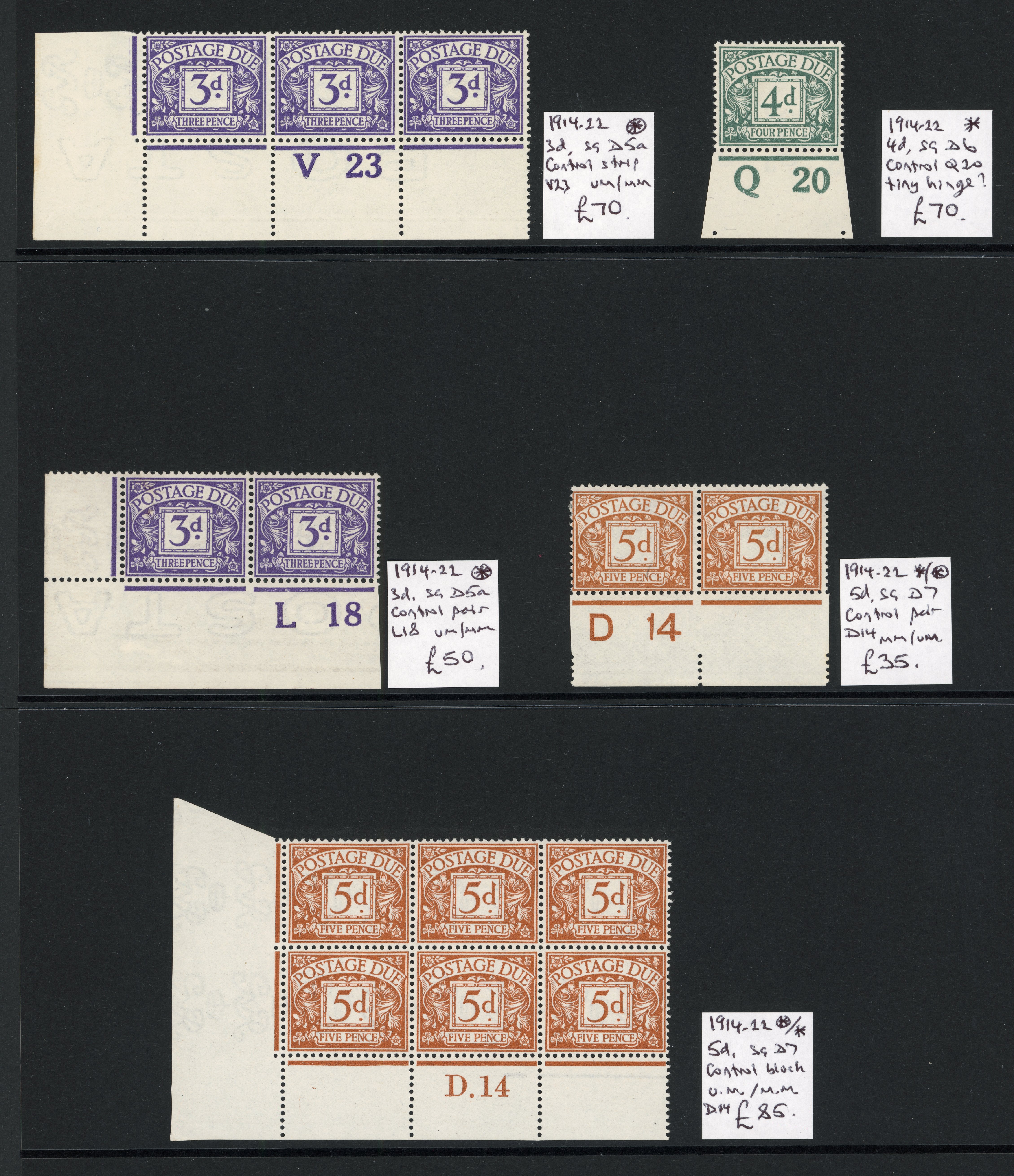 Postage Dues; 1937-57 5d eight blocks of six, and six blocks of four of, also 1/- 1954-55 in block of four, SG D32, D39, D44, D52, unmounted mint, cat. value more than £1000. (Image 1)