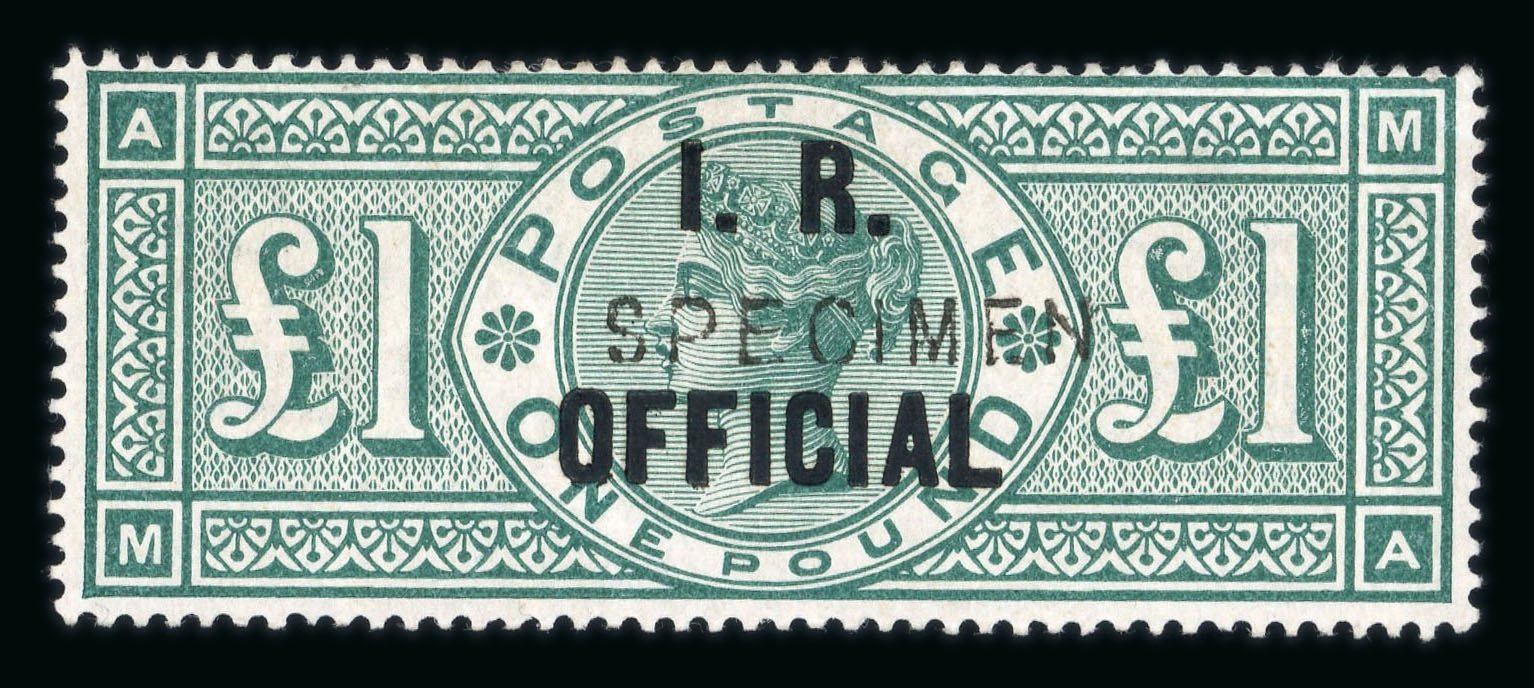 Inland Revenue: 1892 £1 Green I.R. Official mint overprinted "SPECIMEN" type 10, some faint gum bends mentioned for accuracy, fine and fresh (S.G. Concise 2025 £2'250). (Image 1)