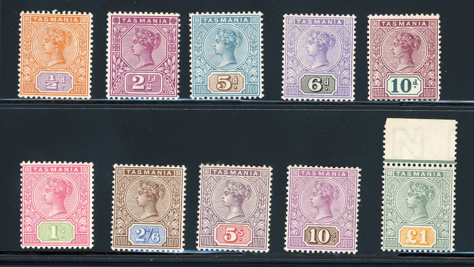 1892-99 1/2d to £1 mint set of 10, with the £1 mint n.h. top marginal, very fine (S.G. £850). (Image 1)