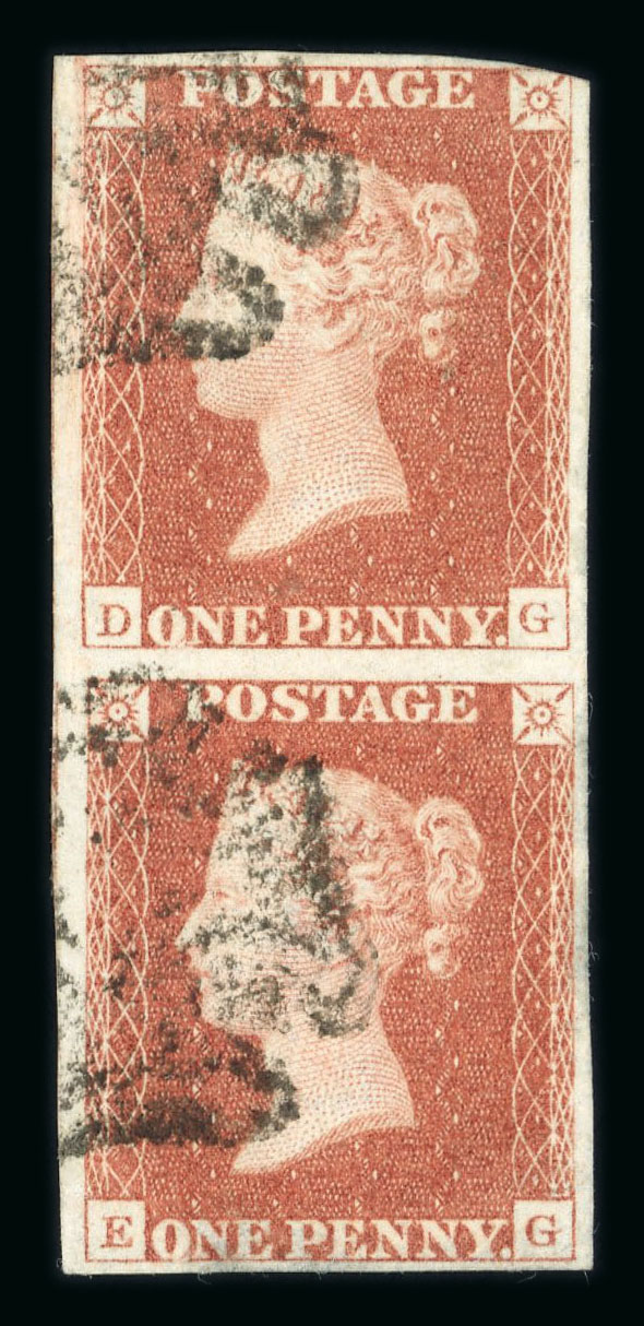 1841 1d pl. 10, red printing from "black plate" in vertical pair DG-EG (margin just touched upper right corner), also a fine four-margin single FG. (Image 1)