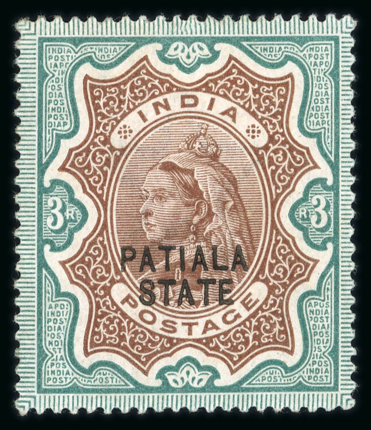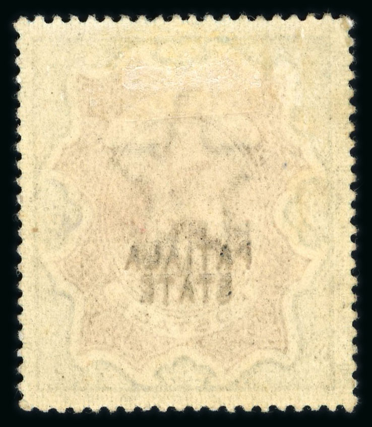 1891-96 1a plum, type 3 opt in black lightly used, with variety 'Patiala' omitted, a fine and scarce item with no more than 201 examples possible (S.G. £600). (Image 1)