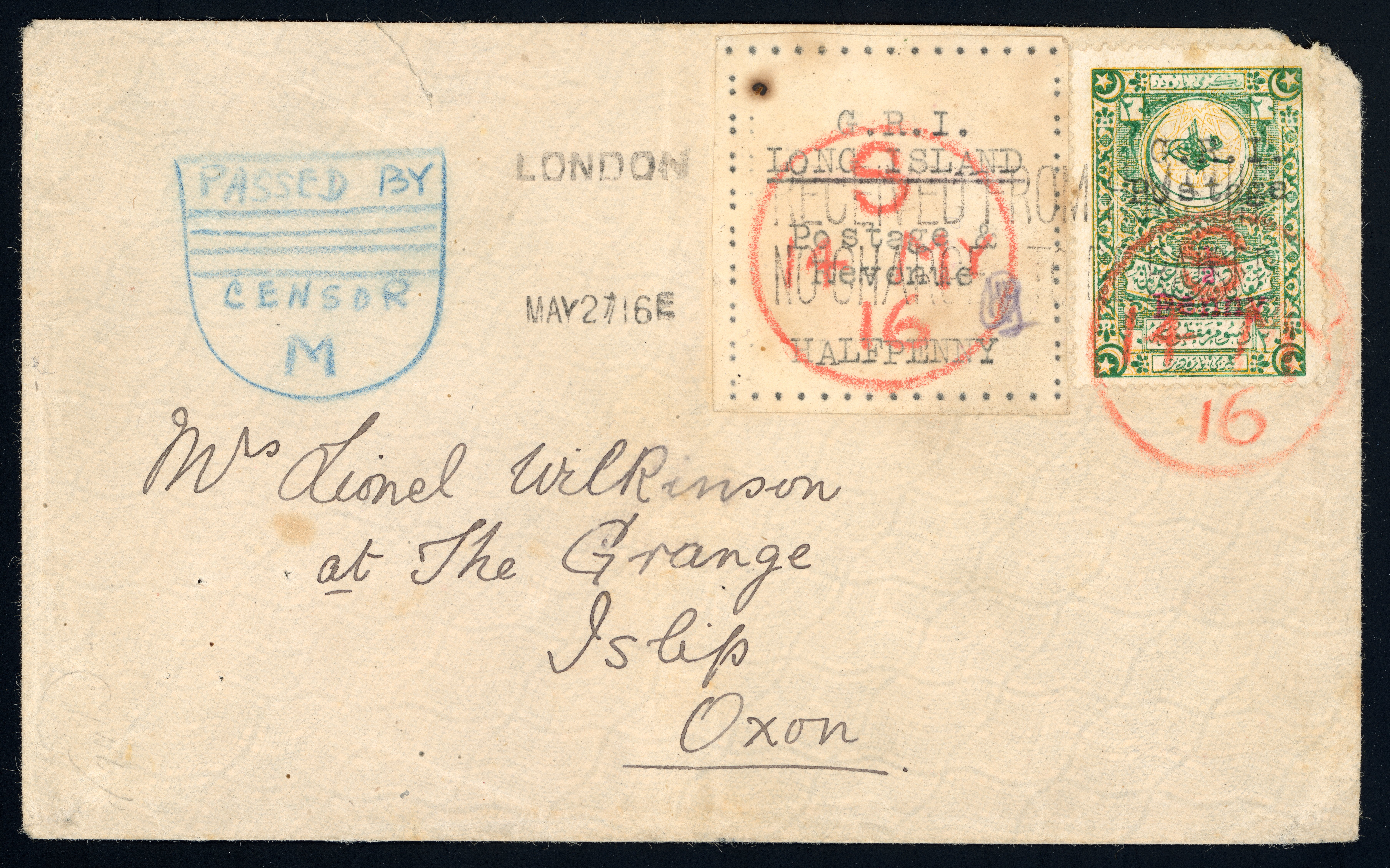 1916 Turkish Fiscal 1/d on 20pa tied on envelope to England along with 1916 wove paper 1/2d by "S / 14 MY / 16" crayon circular datestamp and on arrival with London "RECEIVED FROM H.M. SHIP / NO CHARGE TO BE RAISED" machine ds, blue