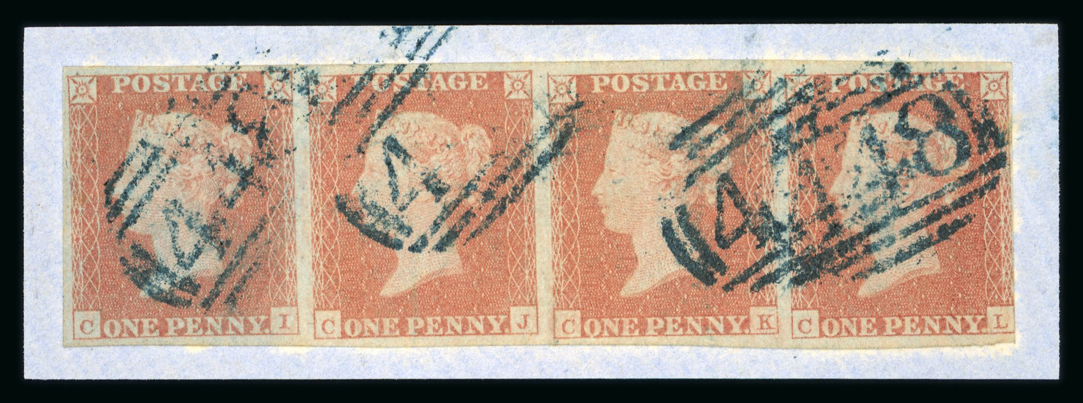 1841 1d. red brown, CI-CL strip of four, close to large margins, used on piece with bluish barred numerals of Leek, fine. (Image 1)