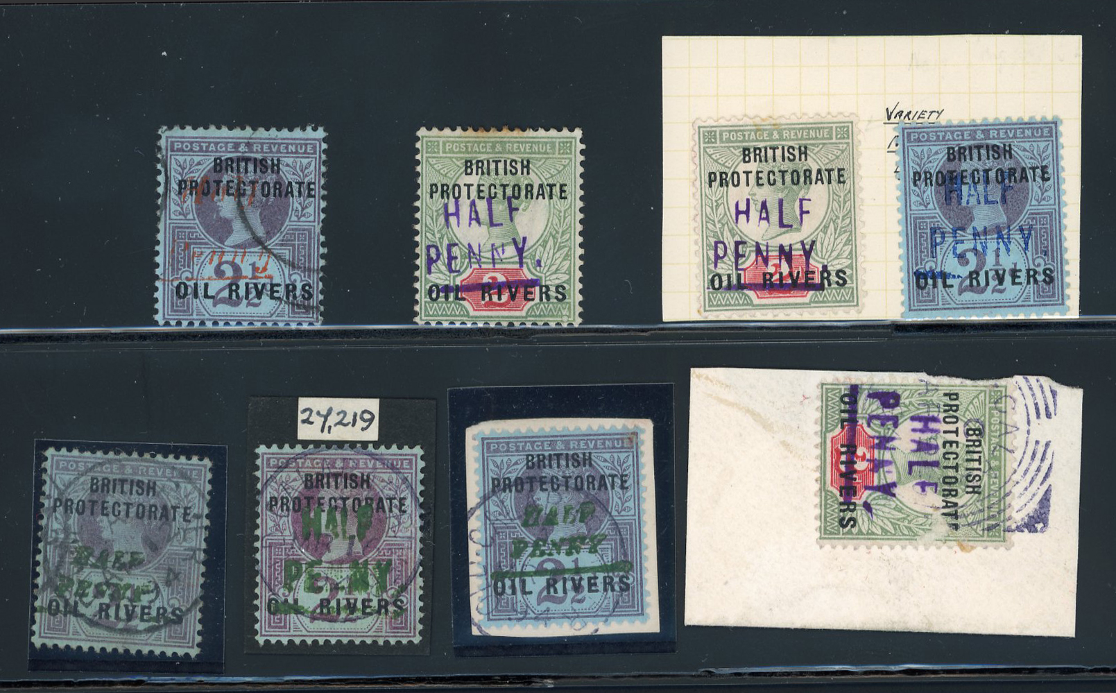 1893 Old Calabar Provisionals group of eight stamps in mixed condition, incl. two S.G. 9 mint (various toning) and one used (surface scuff), S.G. 11 used showing partial double ovpt (colour slightly washed), S.G. 14 mint (tiny thin), S.G.