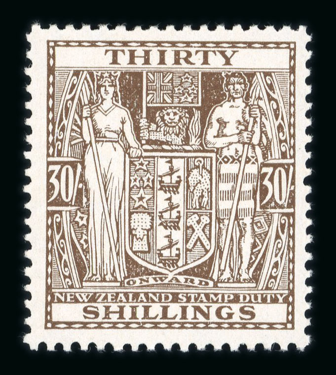 Postal Fiscals: 1940-58 30s brown mint n.h., inverted watermark, very fine and fresh (S.G. £500). (Image 1)