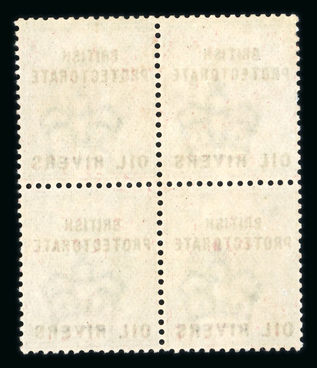 1892-94 overprinted (type 1) 1s dull green in used block of four with two fine strikes of Old Calibar DE 20 93 cds. Scarce. (S.G. £400+). (Image