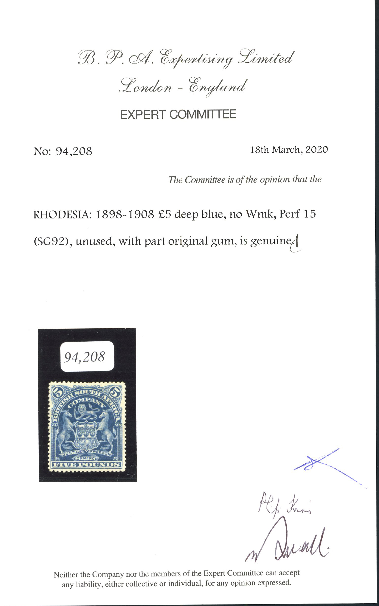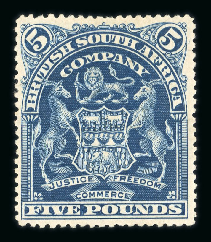 1892-93 £5 sage-green used with large part Kasama N.E.Rhodesia cds, re-perforated at top; cert. Holcombe (S.G. £500). (Image 1)