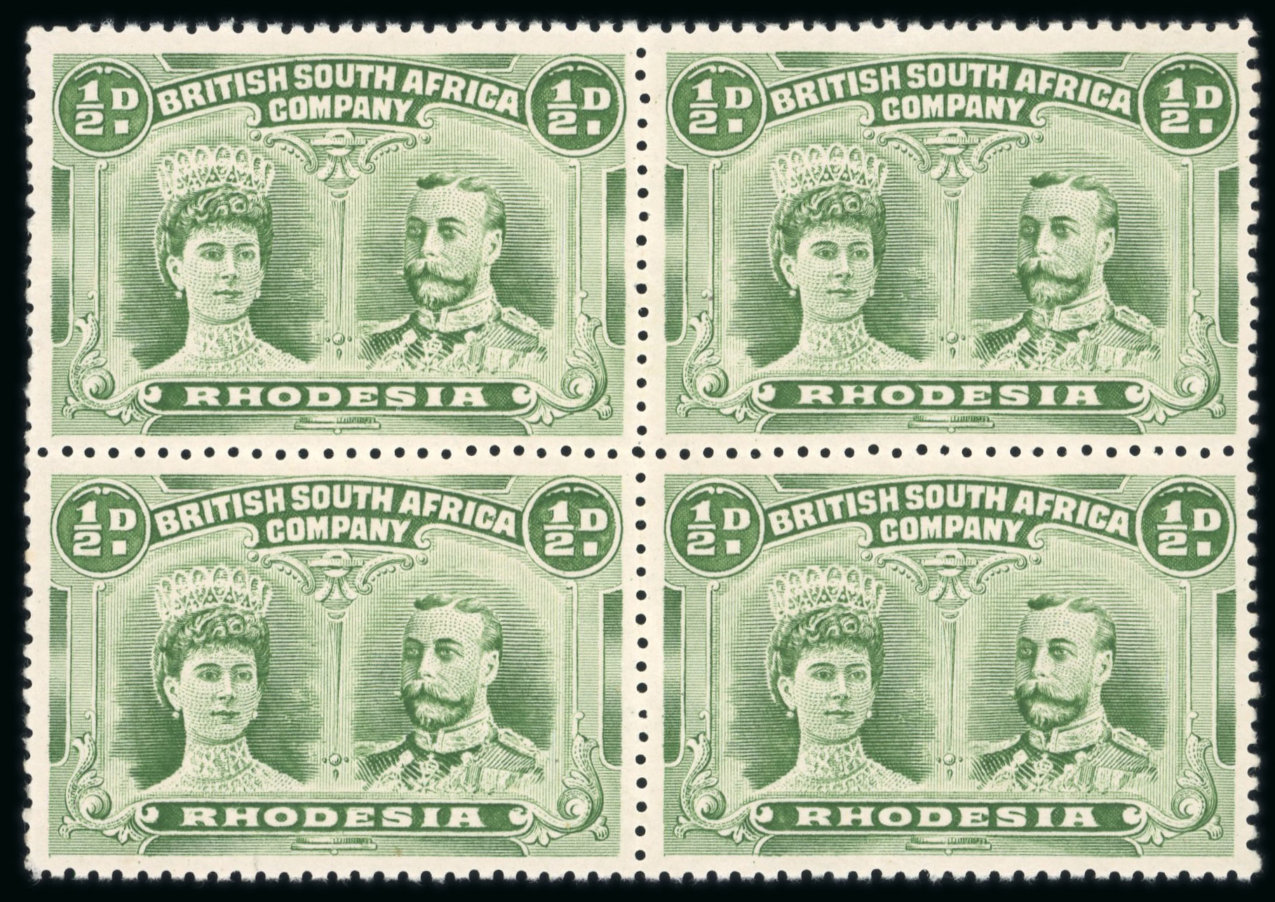 1910-13 1/2d yellow-green perforation 14 in block of four mint, a few hinge remainders and small tone spot, left hand pair mint n.h..; ex Levin and Vestey. (Image 1)
