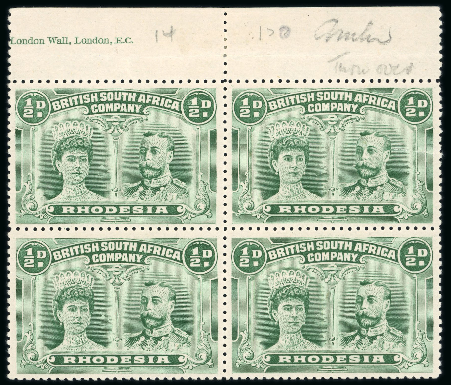1910-13 1/2d dull bluish green perforation 14 upper marginal block of four with part imprint mint n.h. (hinged in margin only), gum creasing and upper right stamp with tear at right. Nevertheless, an attractive multiple of this