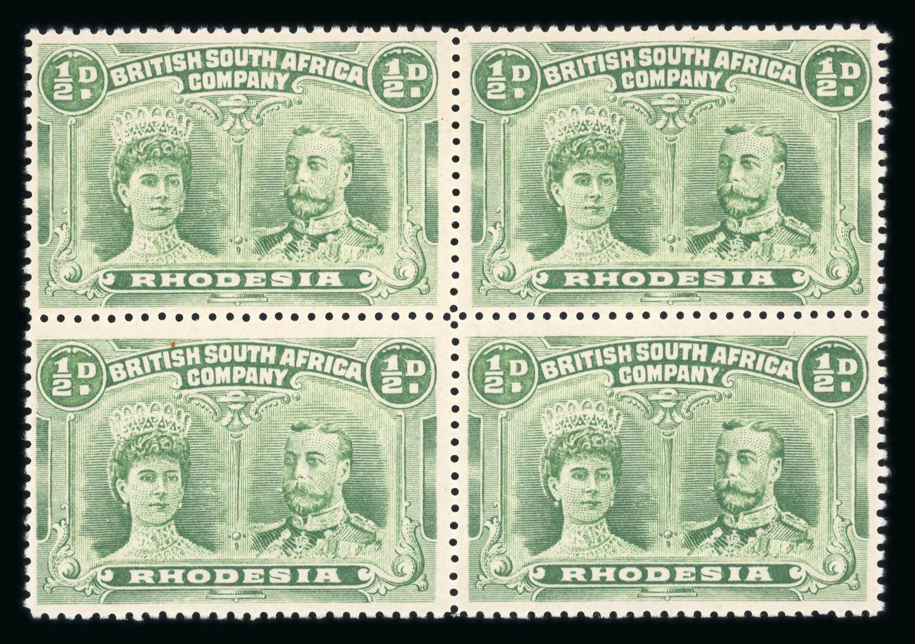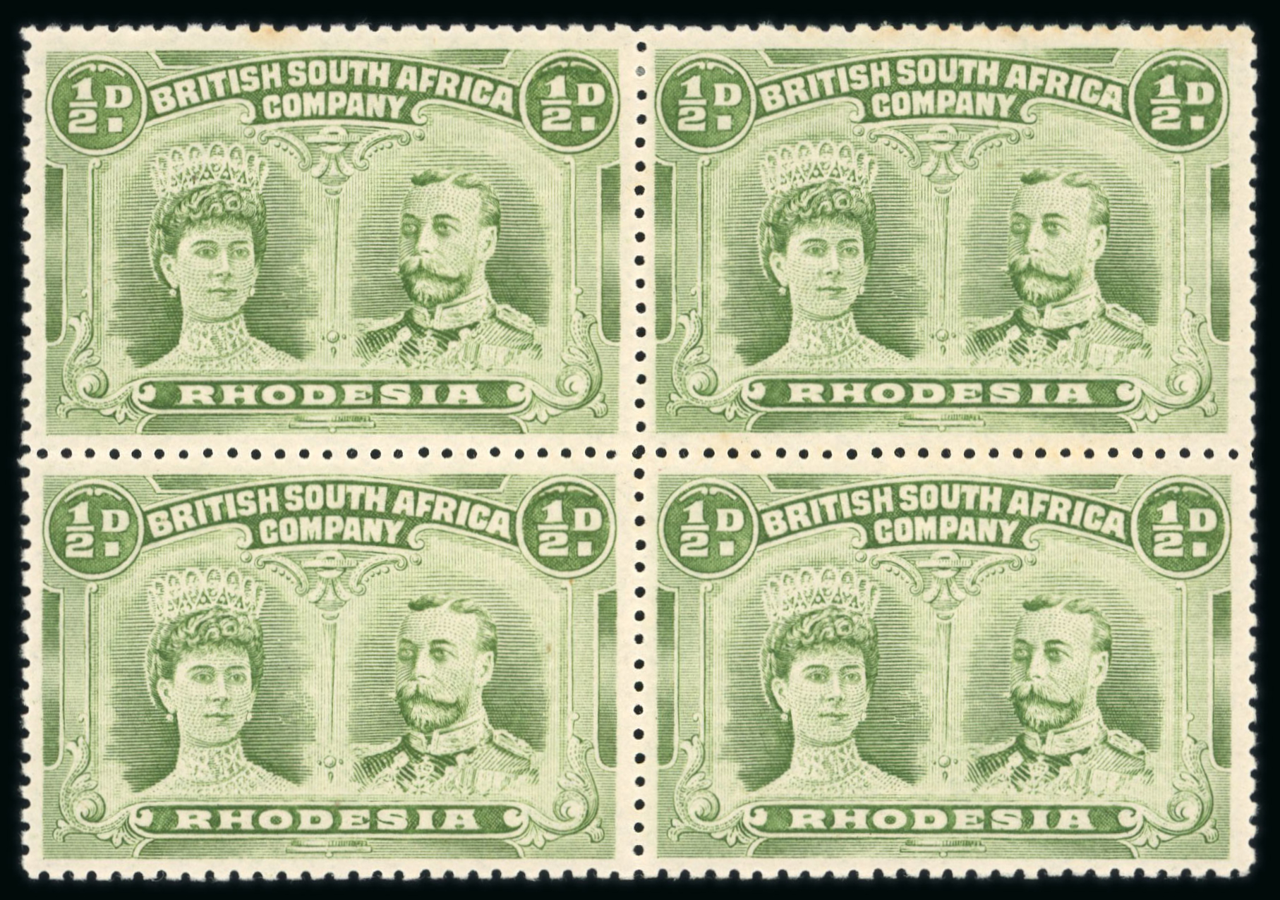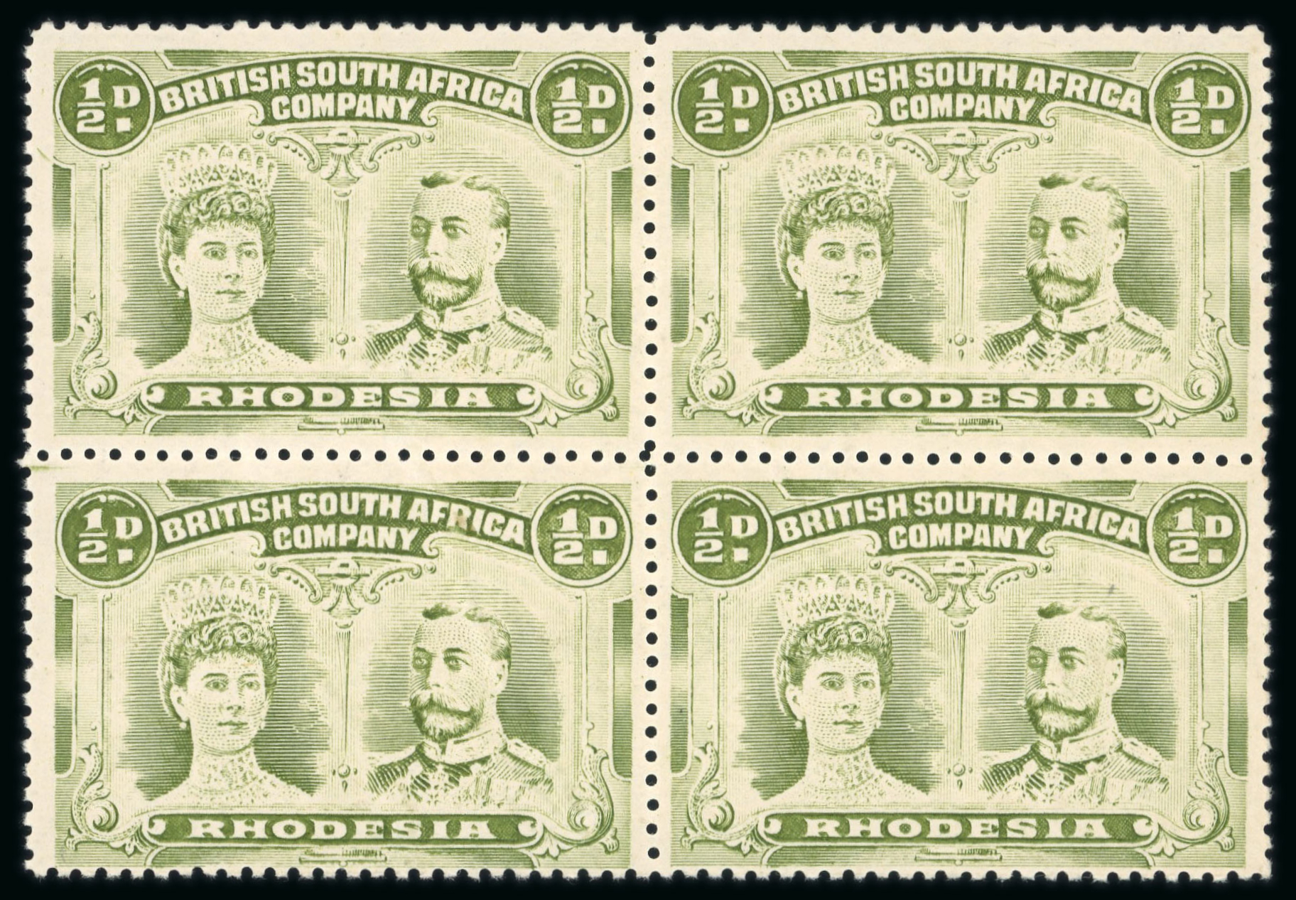 1910-13 1/2d bronze-green perforation 14 in marginal block of four mint, two mint n.h., two with h.r., perf. separation upper pair, a scarce multiple of this specialised shade (RJL 7); ex Wilson. (Image 1)