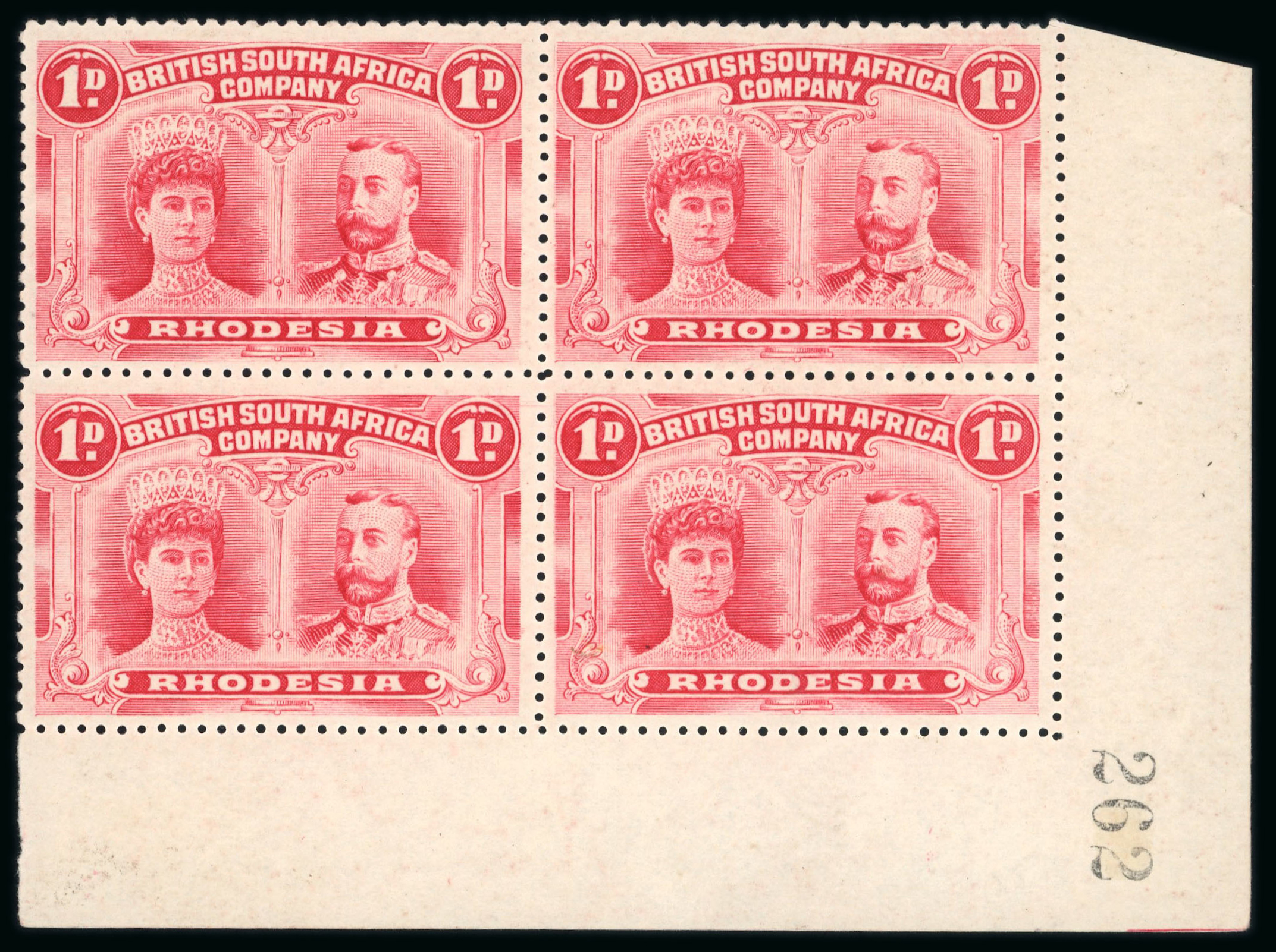 1910-13 1d bright carmine perforation 14 in lower right corner marginal block of 4 (89-100) fine mint (tiny traces of mounts only), "262" sheet number in margin, a lovely multiple; ex Vestey. (Image 1)