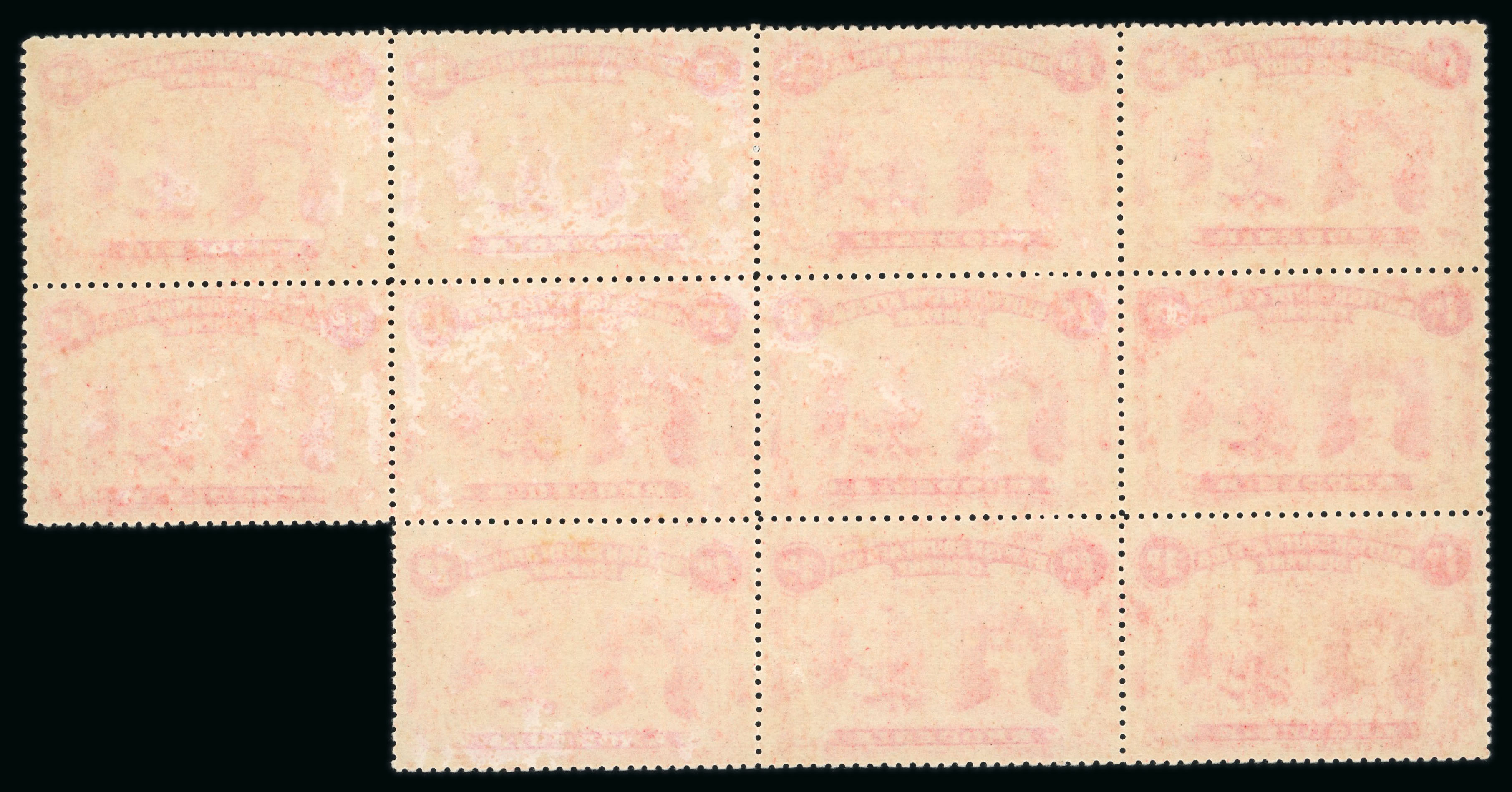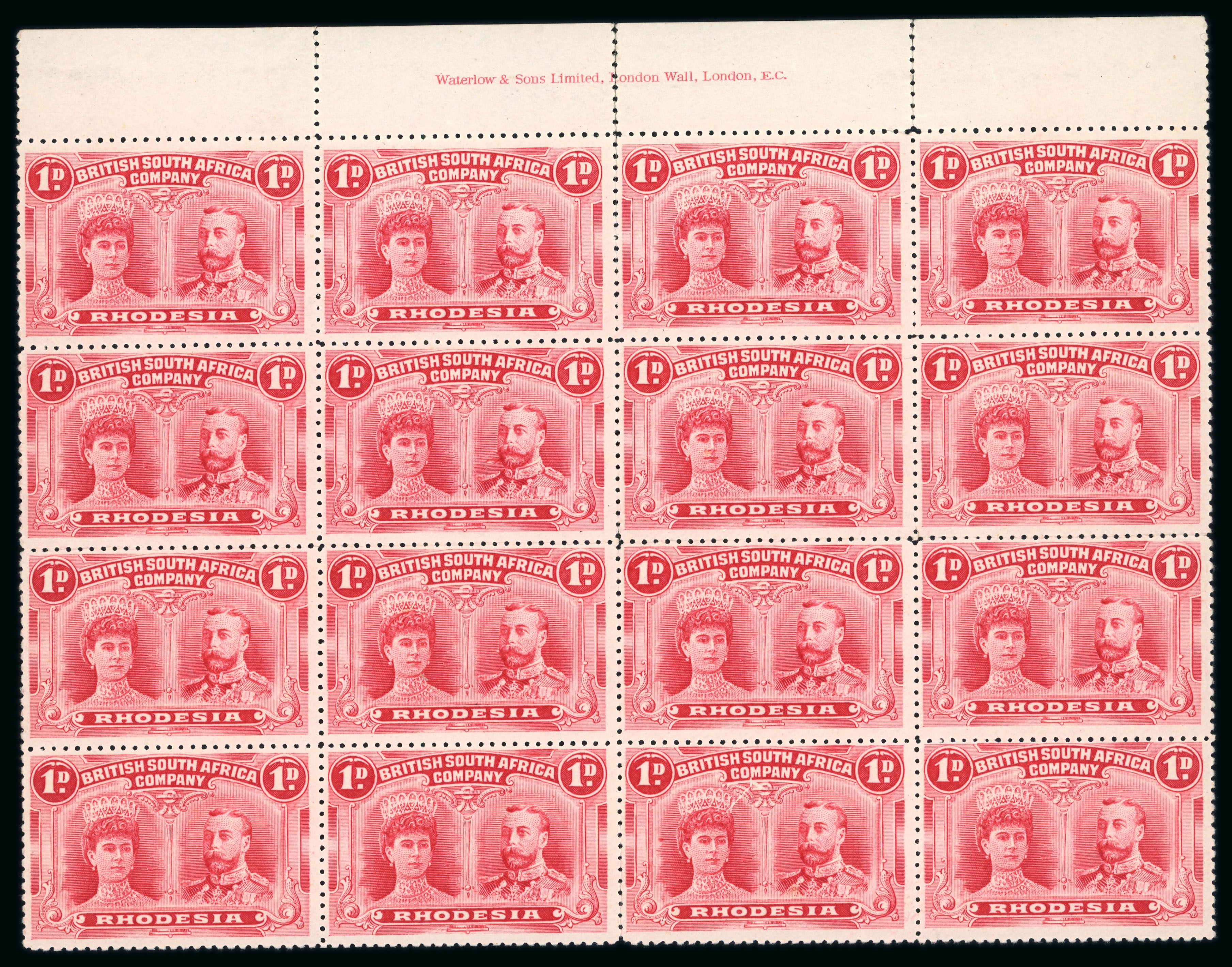 1910-13 1d bright carmine pl. B perforation 14 in upper marginal block of 16 (4-37) mint with full inscription in margin, large part o.g, fine and very fresh. Scarce. (S.G. £640++); ex Gibbs and Wilson. (Image 1)