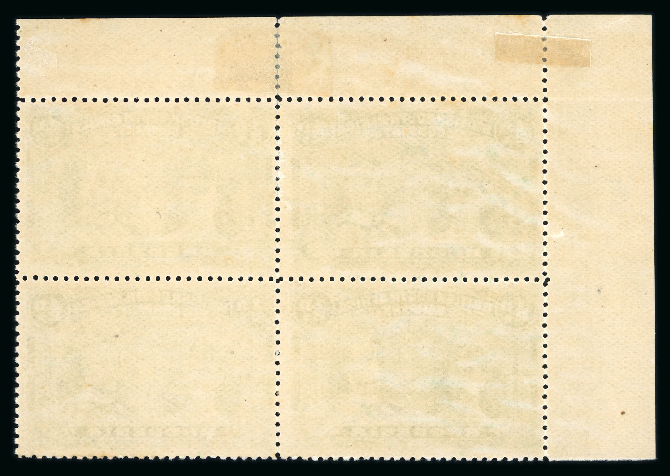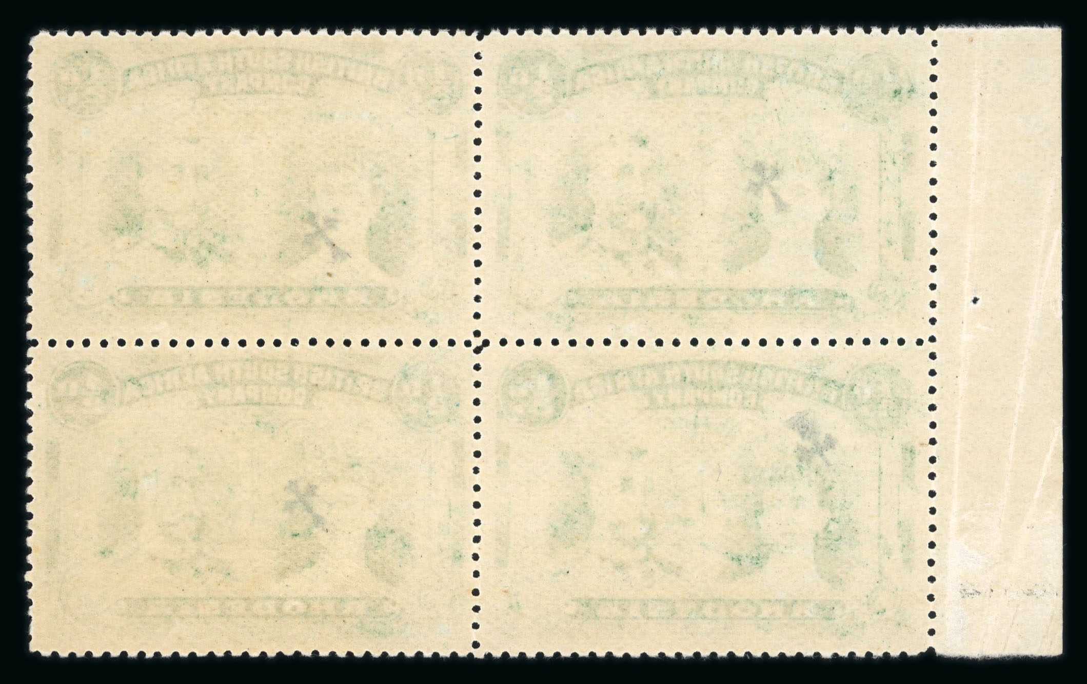 1910-13 1/2d emerald-green perforation 14 pl. III in marginal block of four (21-32) mint n.h., with heavy recut at right, a fine and scarce multiple. (RJL 8); ex Cottonwood. (Image 1)