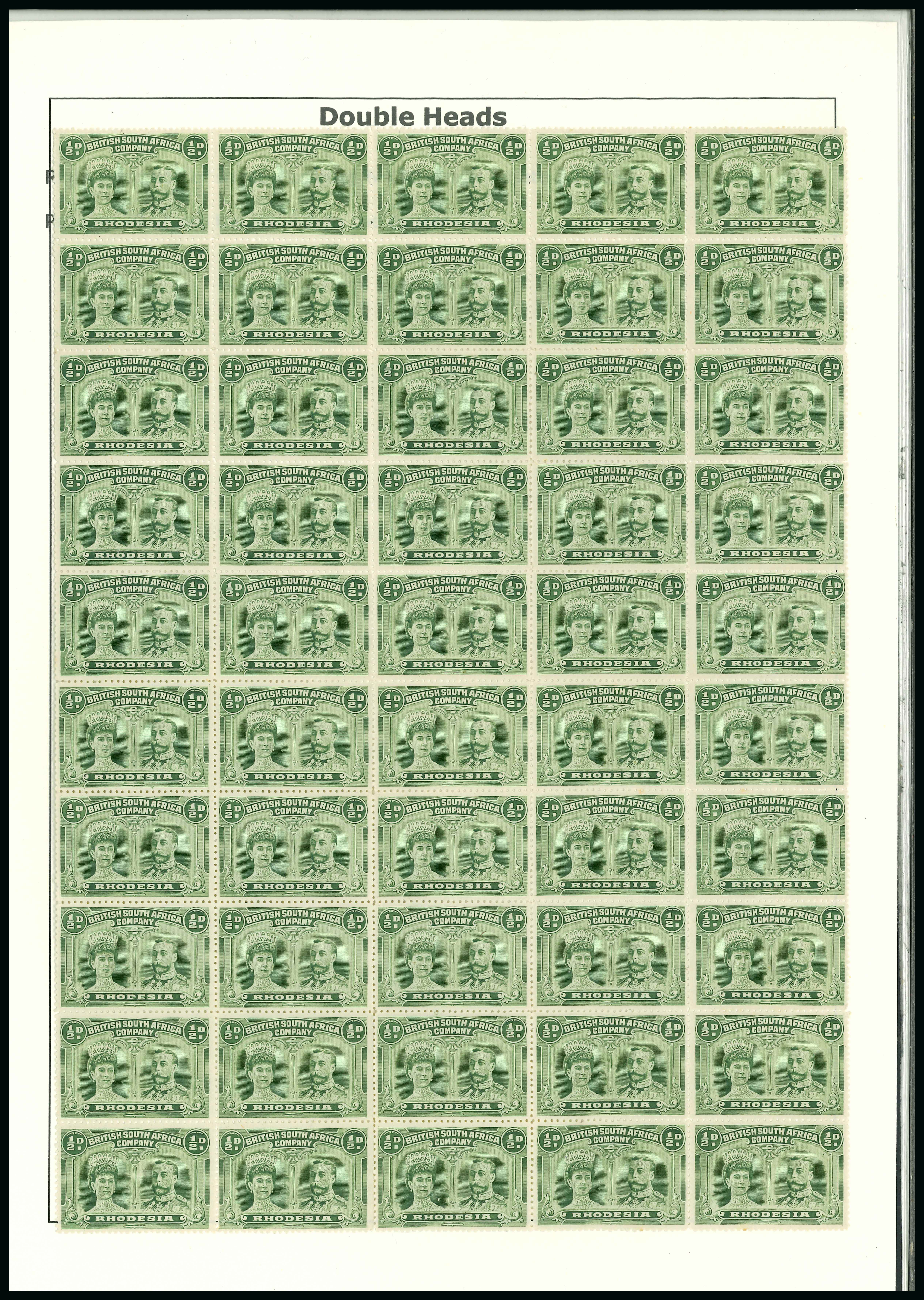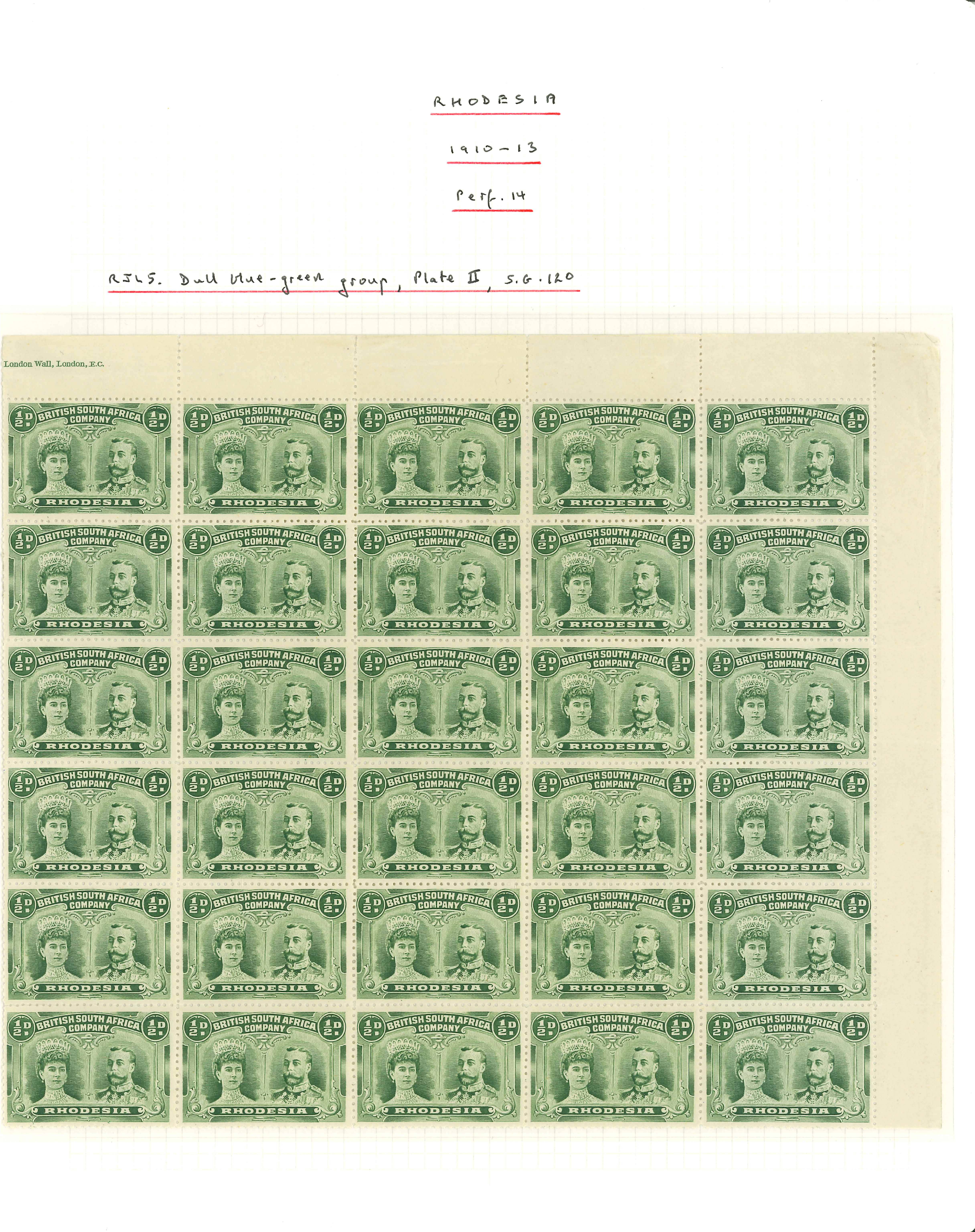 1910-13 1/2d dull blue-green perforation 14 in mint block of fifty (6-100), the right half of the sheet, stamp 29 showing the "double dot" retouch, full original gum, a very fine and scarce multiple (RJL 5); ex Wilson. (Image 1)