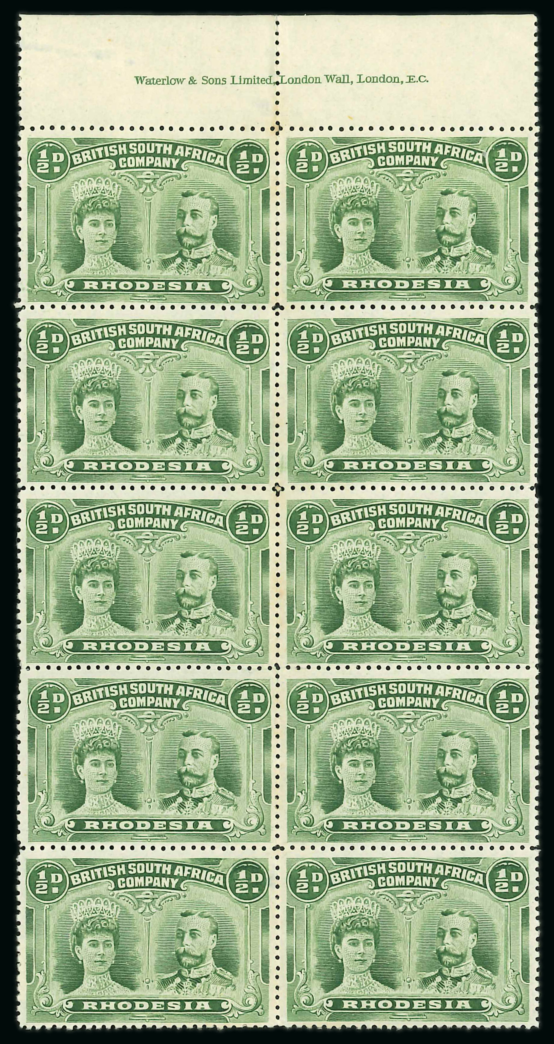 1910-13 1/2d dull blue-green perforation 14 1/4 in upper marginal block of ten (5-46) with full inscription mint, stamps 5-6 with "wedge flaws", 45-46 top right corners recut. A little paper adhesion on reverse, fine and fresh (RJL 5); ex