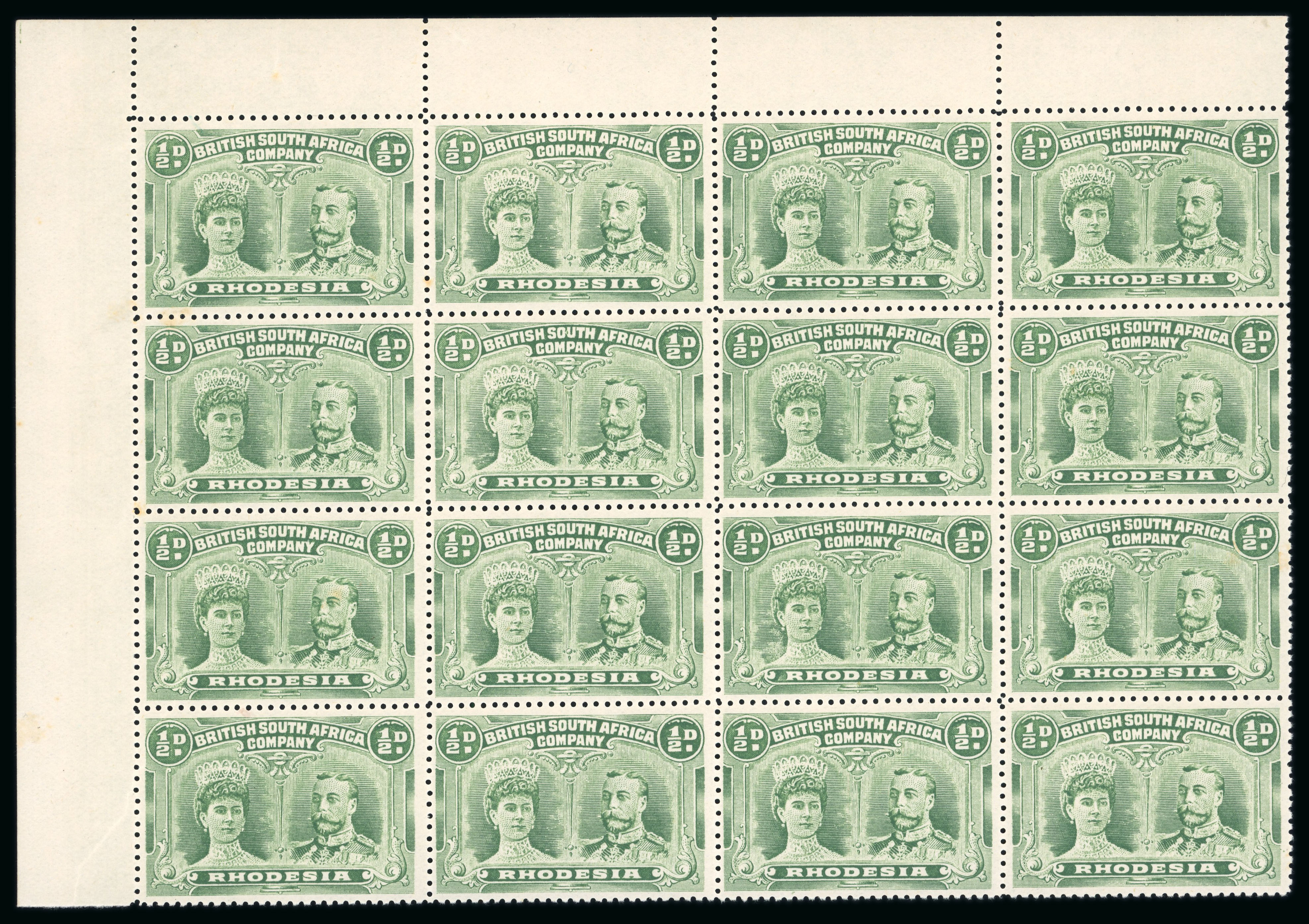 1910-13 1/2d deep dull green pl. III, RJL 9, perforation 14 in mint n.h. upper left corner marginal block of 16 (1-34), pristine; ex Simpson and Gibbs as a sheet of 100, ex Vestey. (Image 1)
