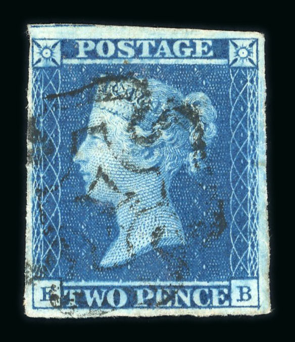 1841 2d blue pl.4 AB, just touched to very large margins, mint large part o.g., one or two light creases, otherwise fine and scarce (S.G. Concise 2025 £3'000). (Image 1)