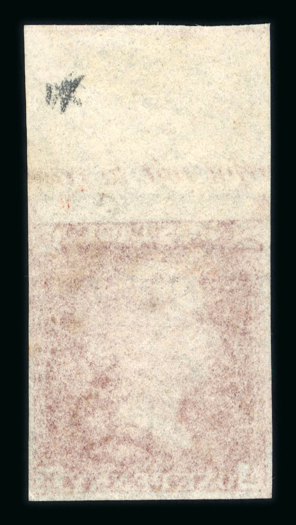 1854 Small Crown 1d red pl. 17 upper marginal imprimatur lettered AK with part inscription, a fine and attractive example. (Image 1)