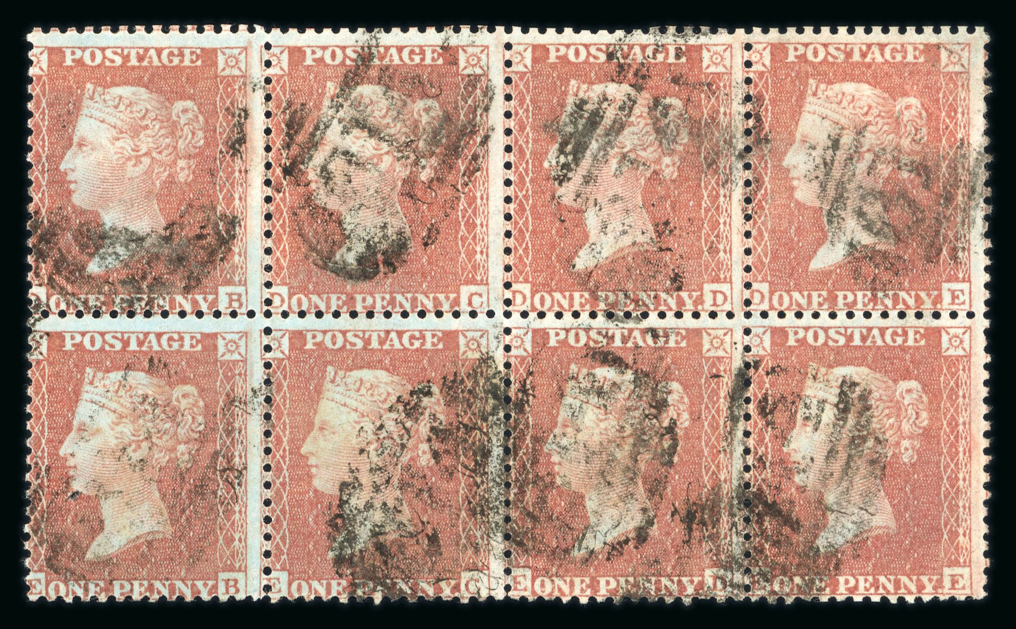 1855 1d yellow-brown die II alphabet II pl. 14 in used block of 8 DB/EE with "814" postmarks of Truro. Fine and attractive, a scarce multiple (S. G. Spec C6(2)). (Image 1)