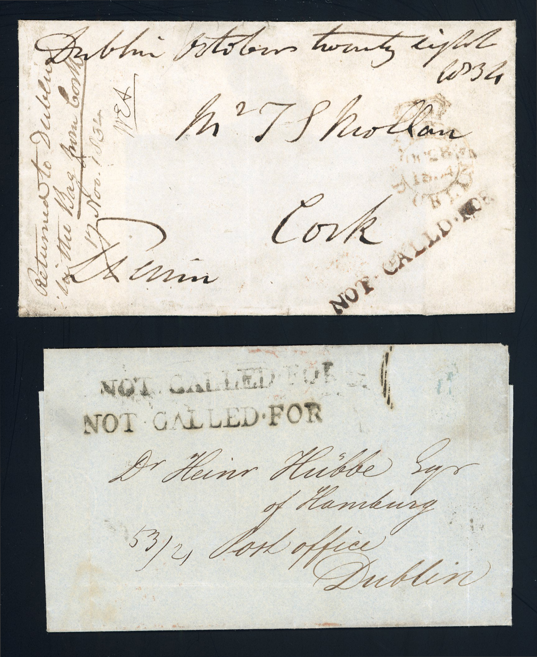 1834 Cover front with part back flaps to Cork, franked free and with FREE/DUBLIN crown ds, showing on face the rare NOT CALLED FOR in red, and manuscript "Returned to Dublin in the Bag from Cork", plus another entire dated 1844 with