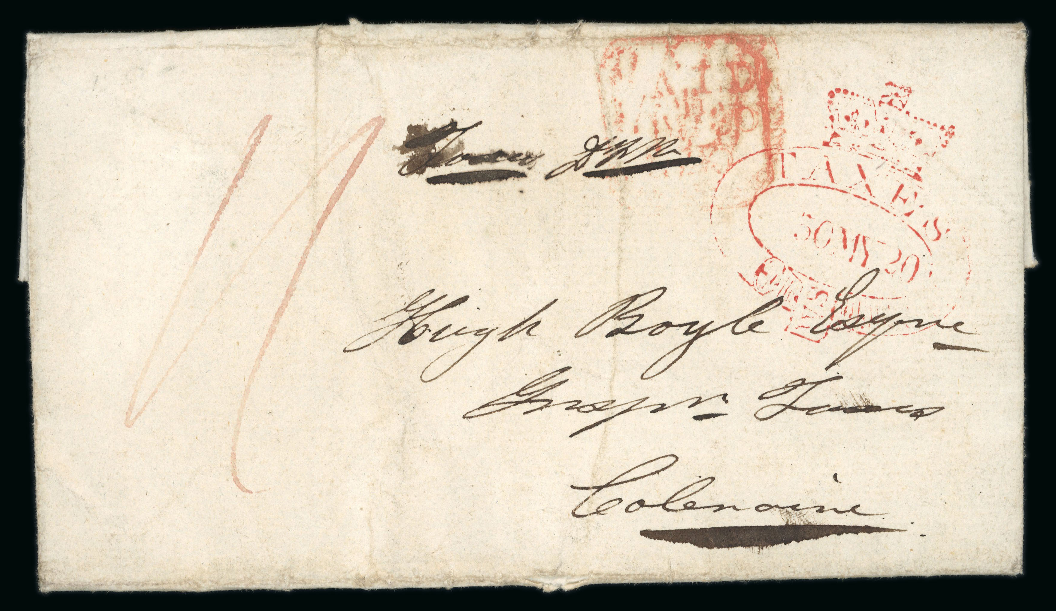 bearing the scarce fancy POSTAGE to DUBLIN/NOT PAID oval in red, array of bs in red one being a Sunday ds of 26th of June, attractive and scare usage, ex. Thomas Field (Image 1)