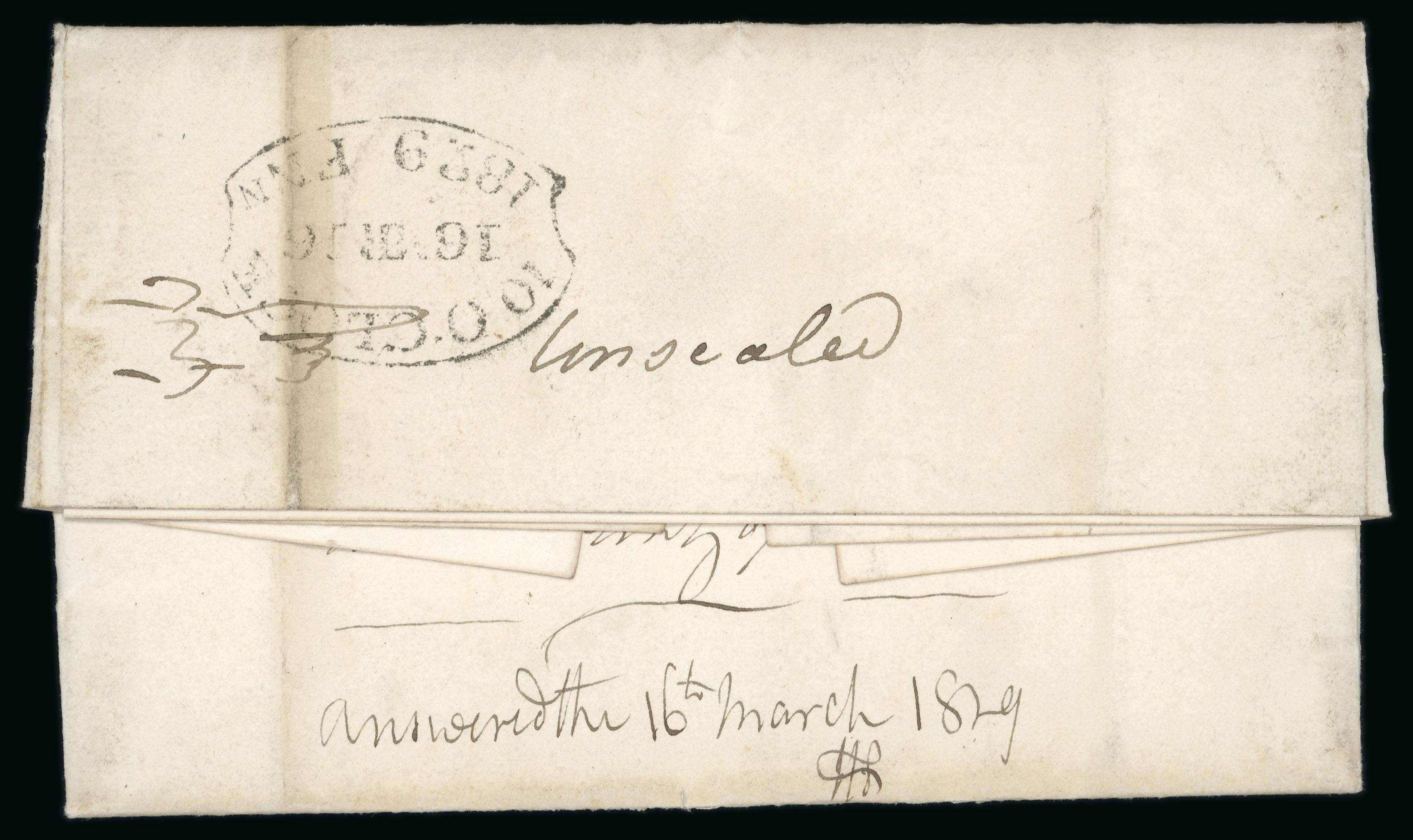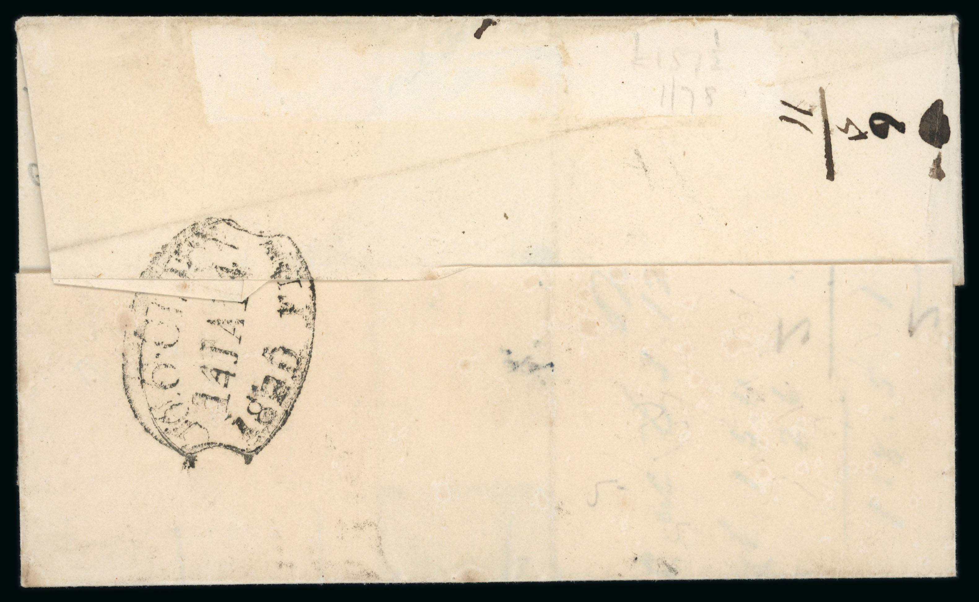 1834 (May 29th) Folded entire sent from Philadelphia to Belfast and received on the "1. July 1834", showing a wonderful strike of the large black "PACKET SHIP SARAH SHEAFE / MALCOMSON & BELL AGENT/ NO 9 DONEGAL QUAY / BELFAST", a