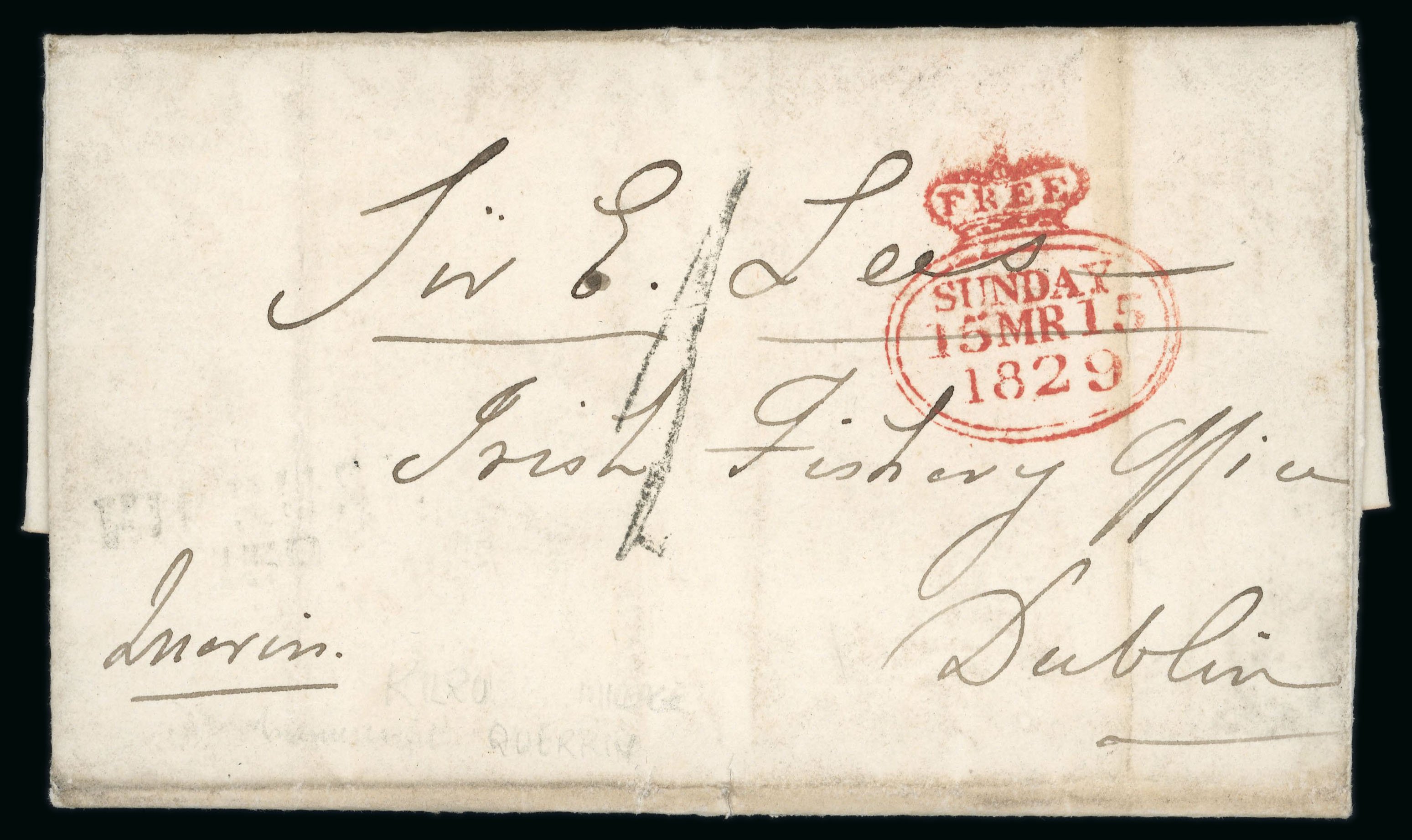 1829 (12.3) Folded entire sent from Kilrush, Co.Clare, to Irish Fishery Office, Dublin, showing faint KILRUSH/139 black mileage mkg with fine strike of the rare Dublin crowned oval FREE/SUNDAY/15MR15/1829, rated with handstruck "1", very