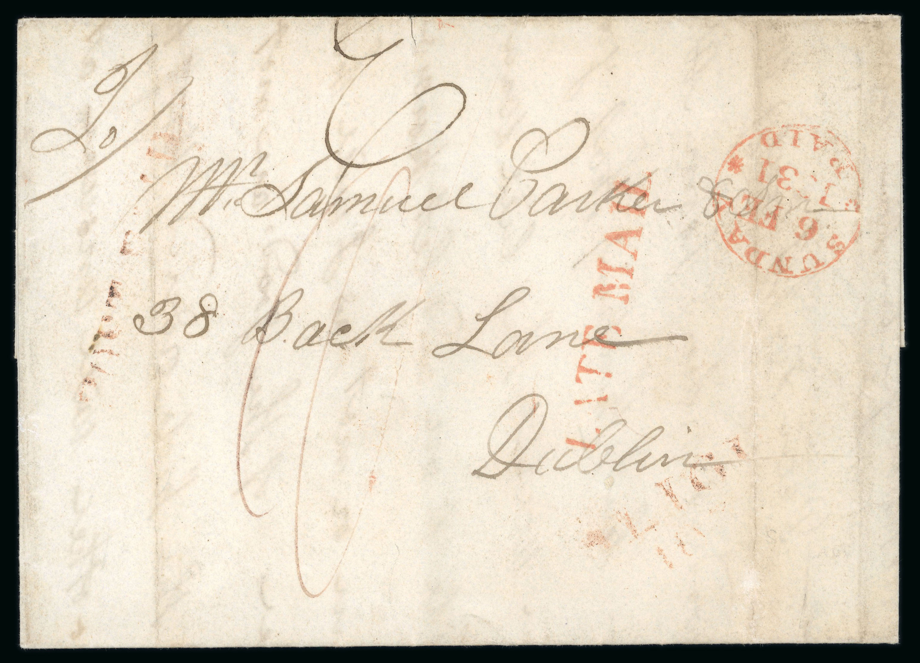 1831 (6.2) Folded letter sheet sent from Sligo to Dublin, showing linear LATE MAIL, faint SLIGO/103 and scarce SUNDAY/PAID/6.FE.1831 cds, all in red, fine. (Image 1)