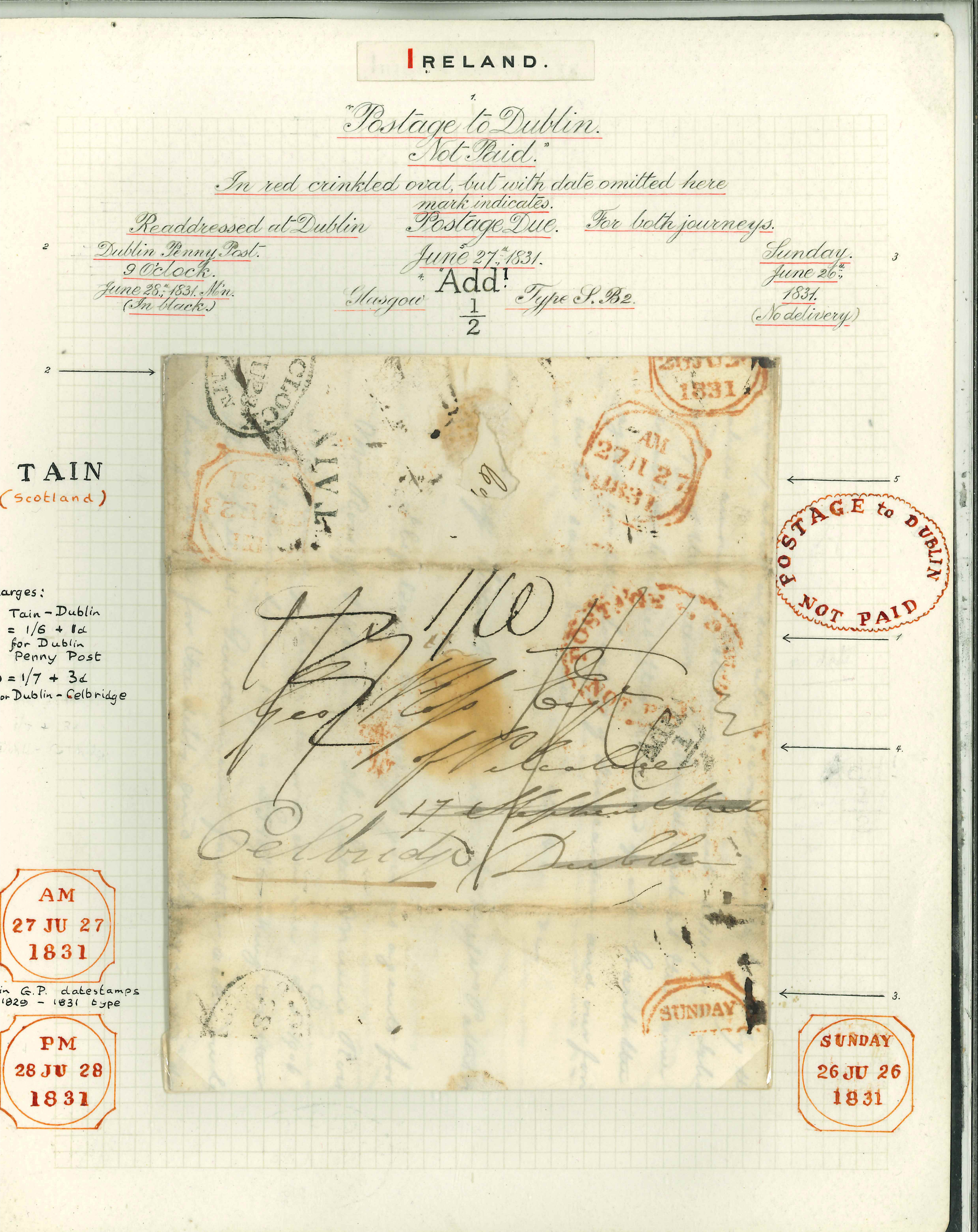 1831 (22.6) Folded entire from Tain, Scotland, to Dublin and redirected onto Celbridge, mounted and written up on Field exhibit page, paying "1/6" Tain to Dublin, plus 1d for Dublin Penny Post and 3d for onward journey to Celbridge,