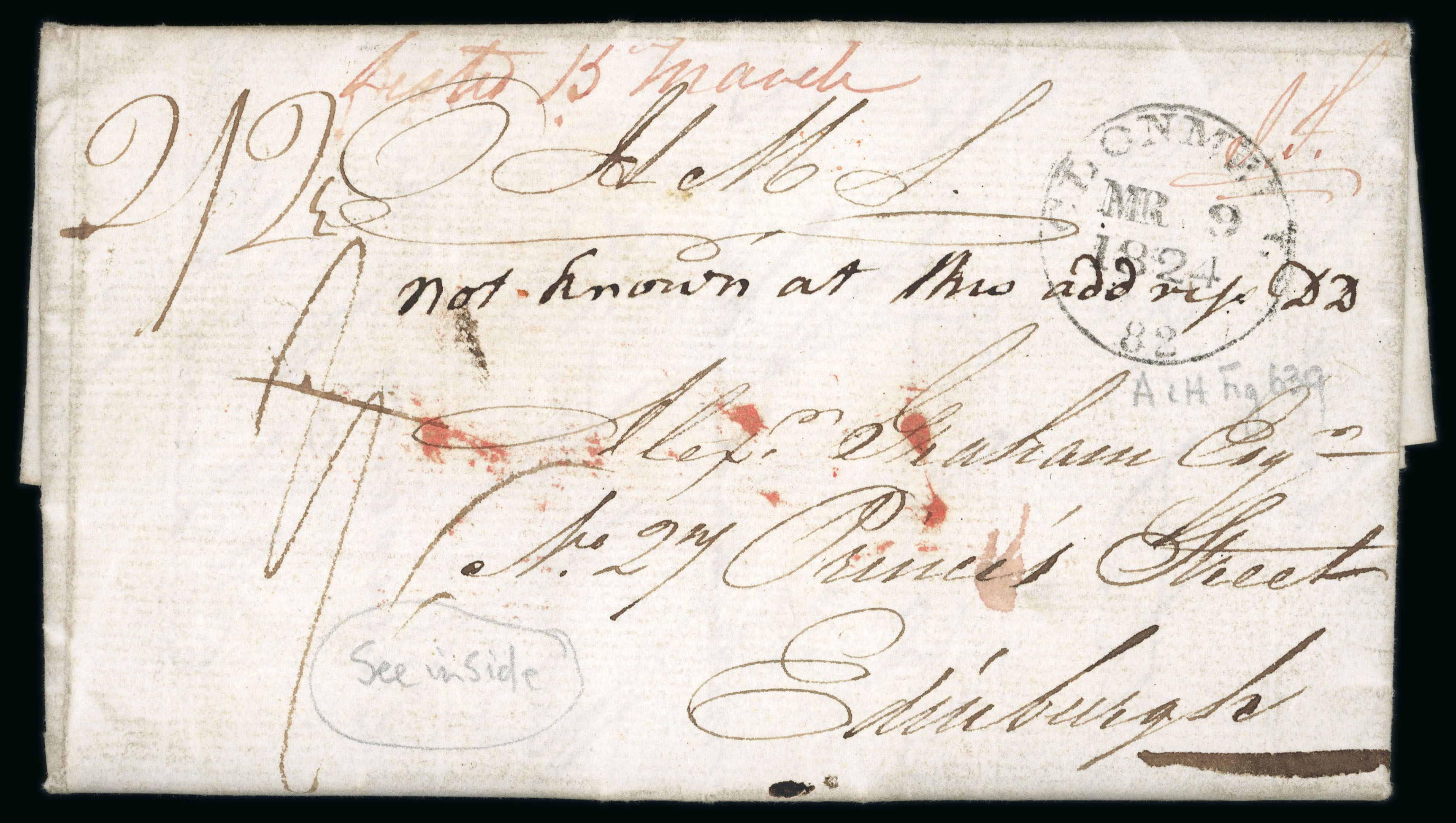 POSTAGE TO LONDON NOT PAID in red, then sent to Dublin with with on arrival there, the scarce red oval POSTAGE/L.C.O./NOT PAID of the Dublin letter Carrier's office also applied in red, and finally redirected to Edinburgh arriving one year after