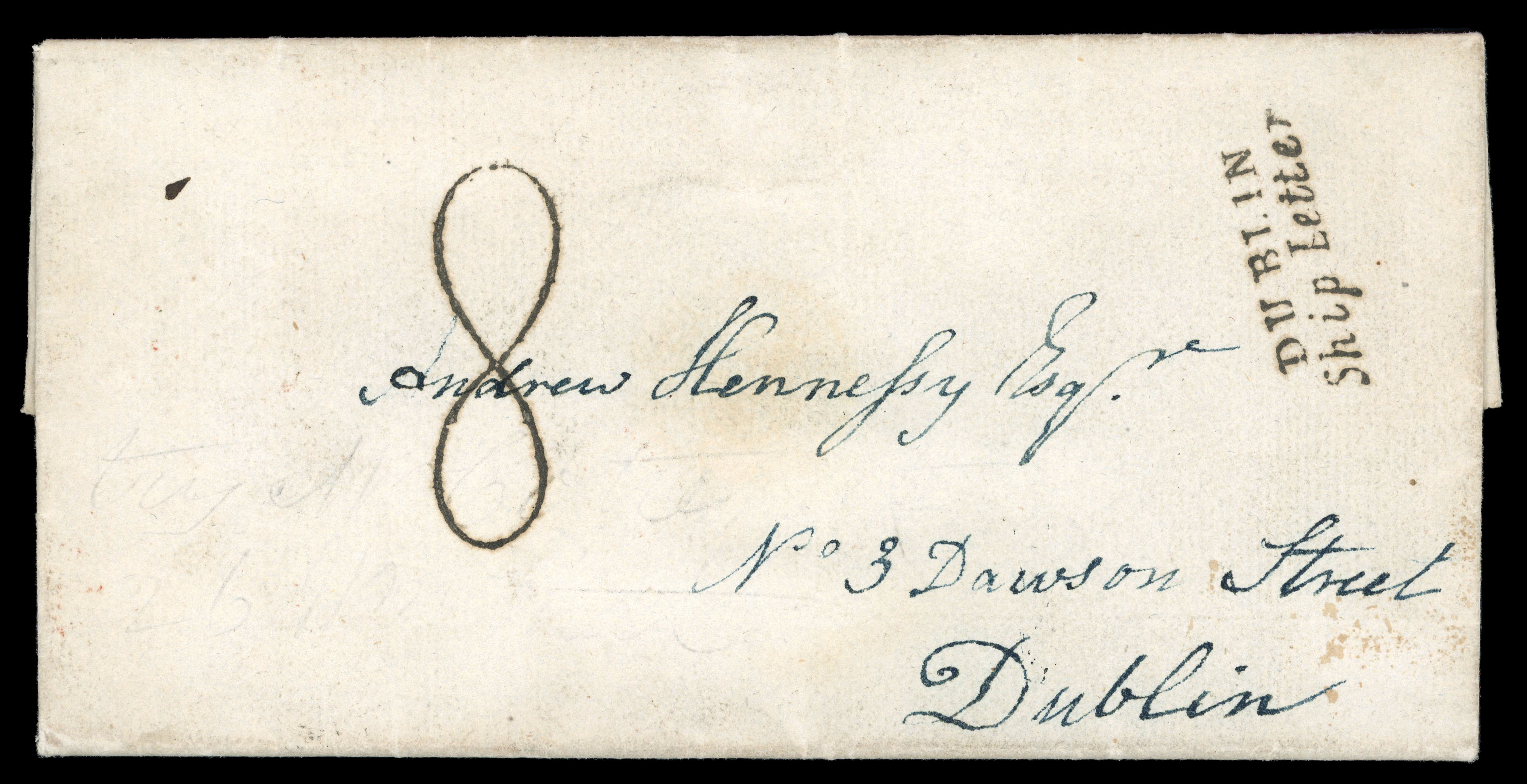 1839 (October 14th) Folded cover sent from Sydney, Australia via Dublin to London, showing a red oval PAID SHIP LETTER / OC * 14 / 1839 / SYDNEY ds, with deleted colonial postage "3" and rated "8", ship letter rate, plus mixed typeface