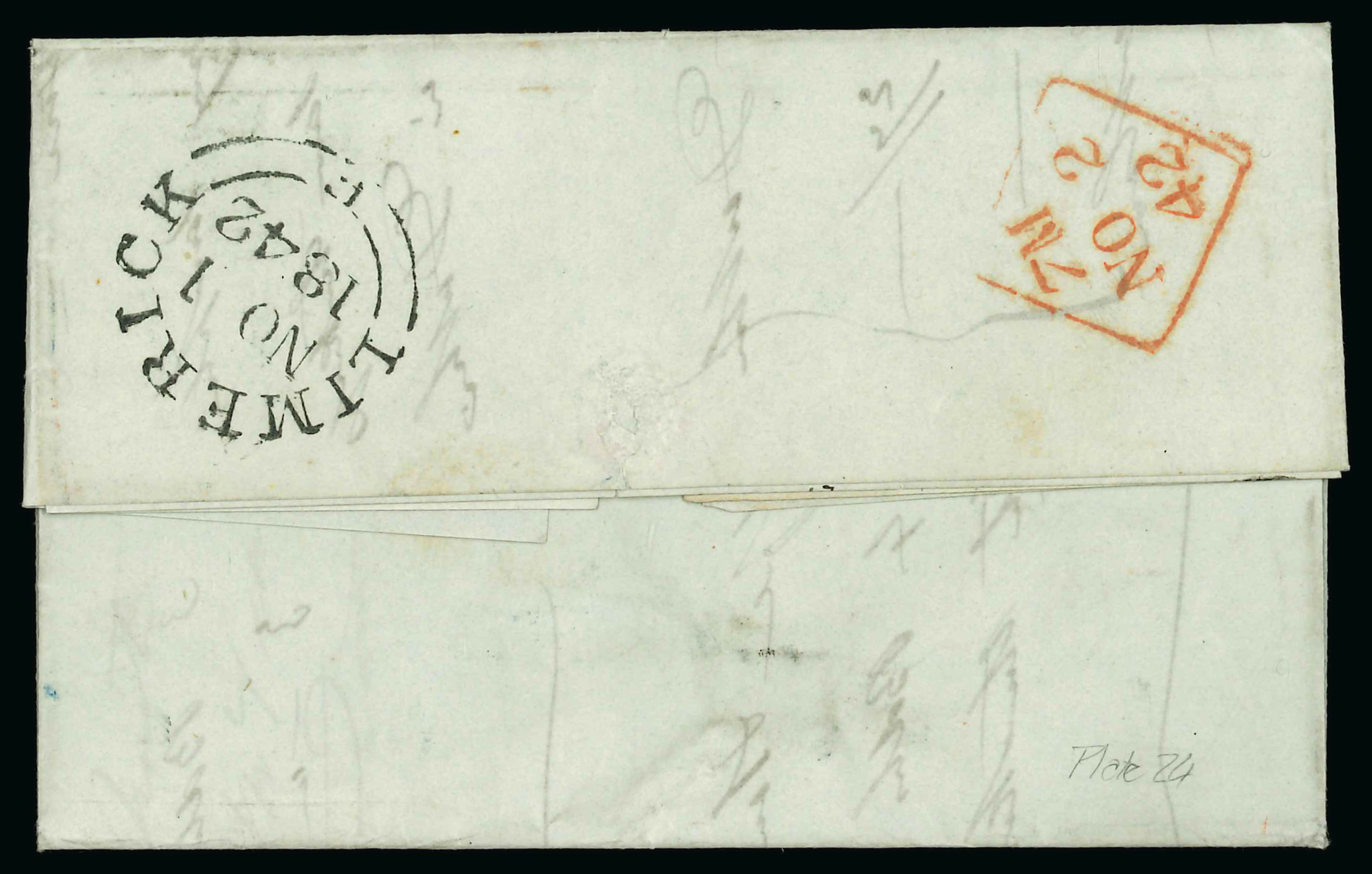 1840 (2.7) Prepaid folded entire from Kilcock showing an exceptional strike of the Dublin coded "11/PAID/1d." hs, plus framed Dublin "PAID/JY 22/1840" ds, all in red, very fine and scarce, ex. Fred Dixon. (Image 1)