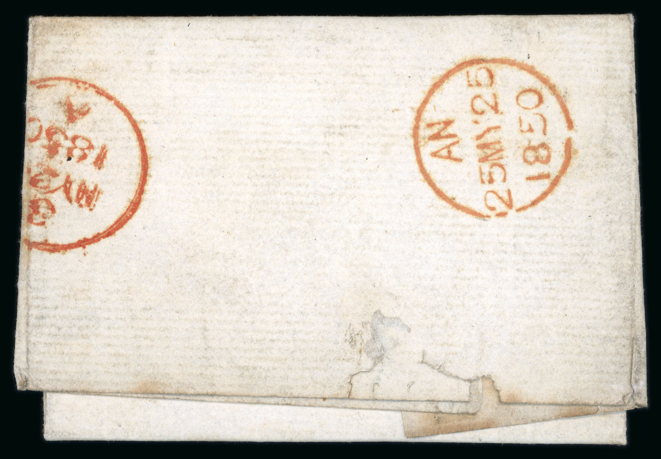 1838 Folded entire from Geneva, Switzerland, to Dublin and redirected to Westport, Co. Mayo, bearing clear 3-line italic Postage to/Dublin/not paid in red, plus 1839 folded letter sheet with similar strike in black, a fine and scarce