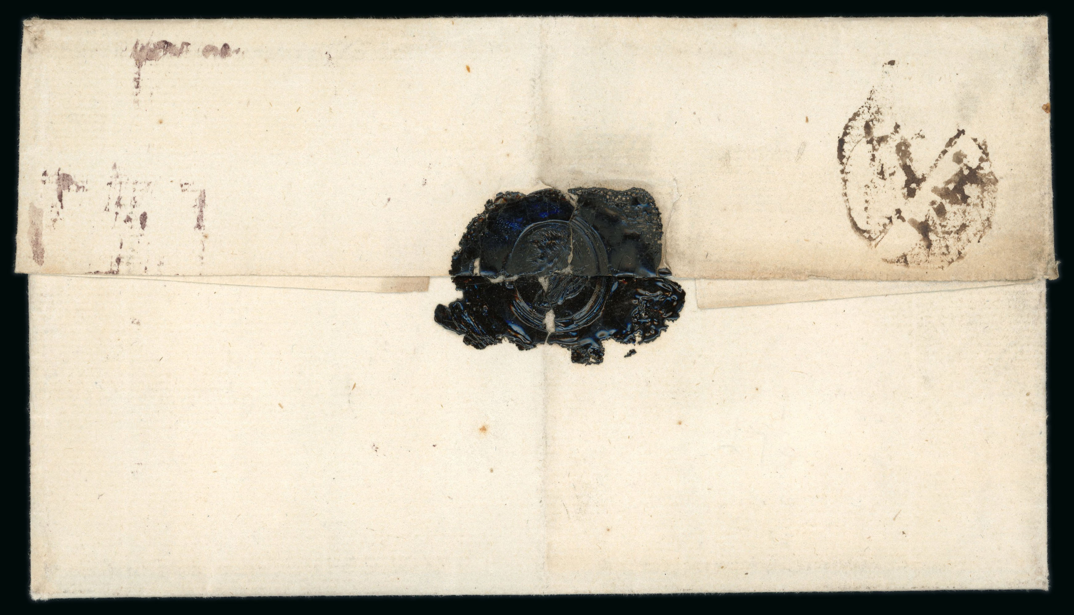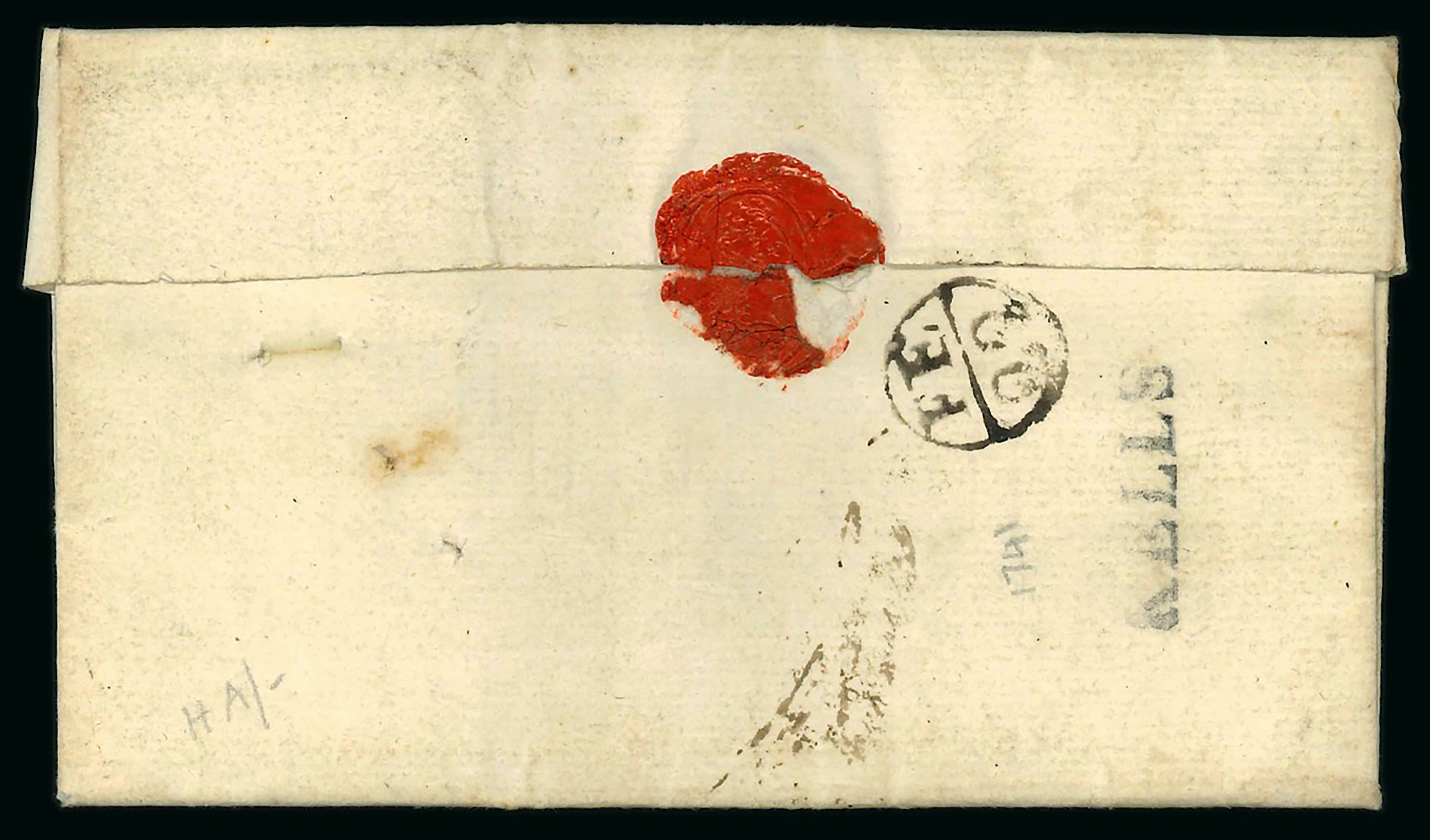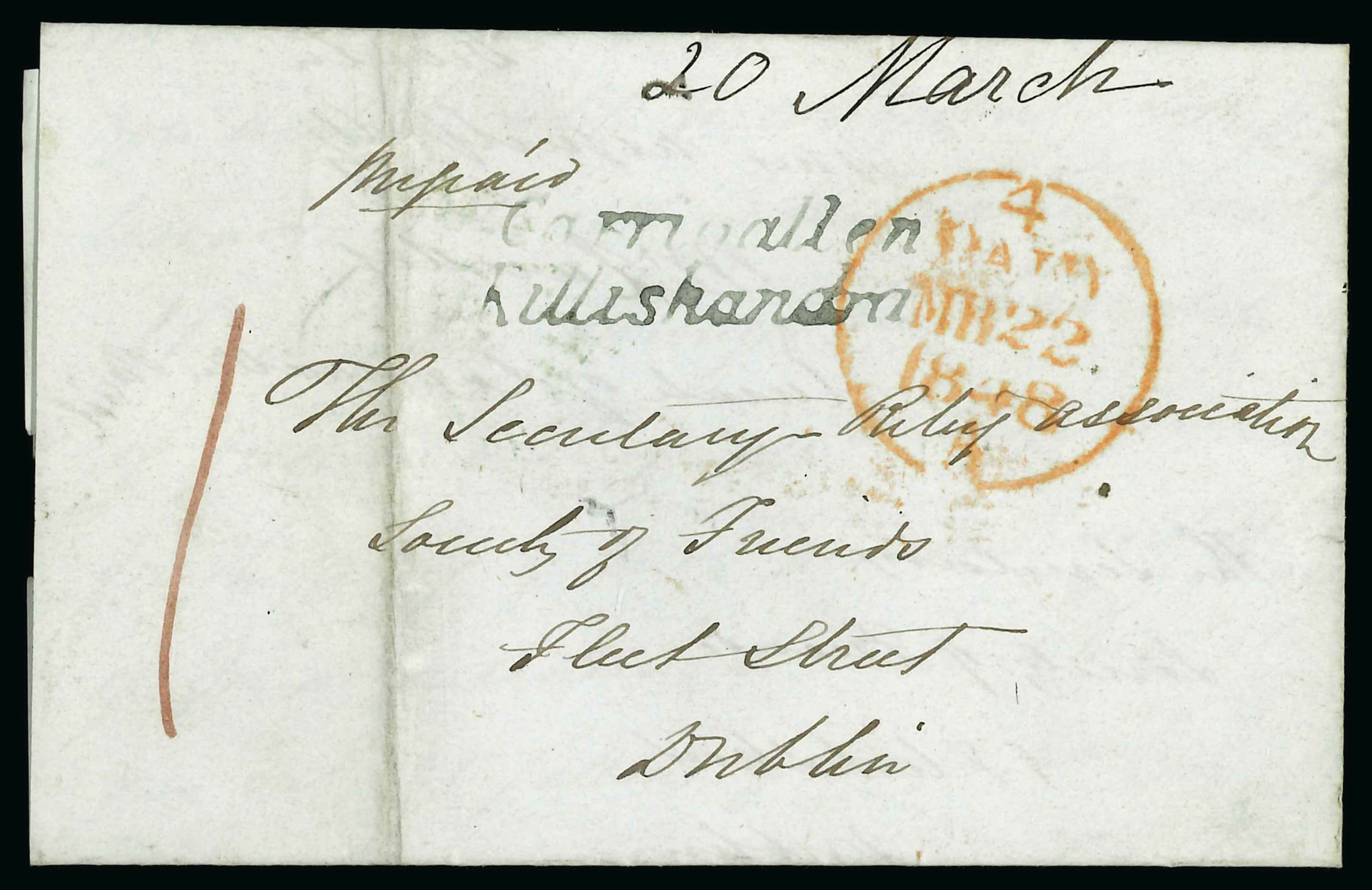 Kilkenny: 1835 Folded entire from Kilkenny to Dublin, bearings distinctive sherif boxed PAID AT/KILKENNY hs in black showing two different font sizes, red boxed PAID ds alongside, very fine and unusual strike. (Image 1)