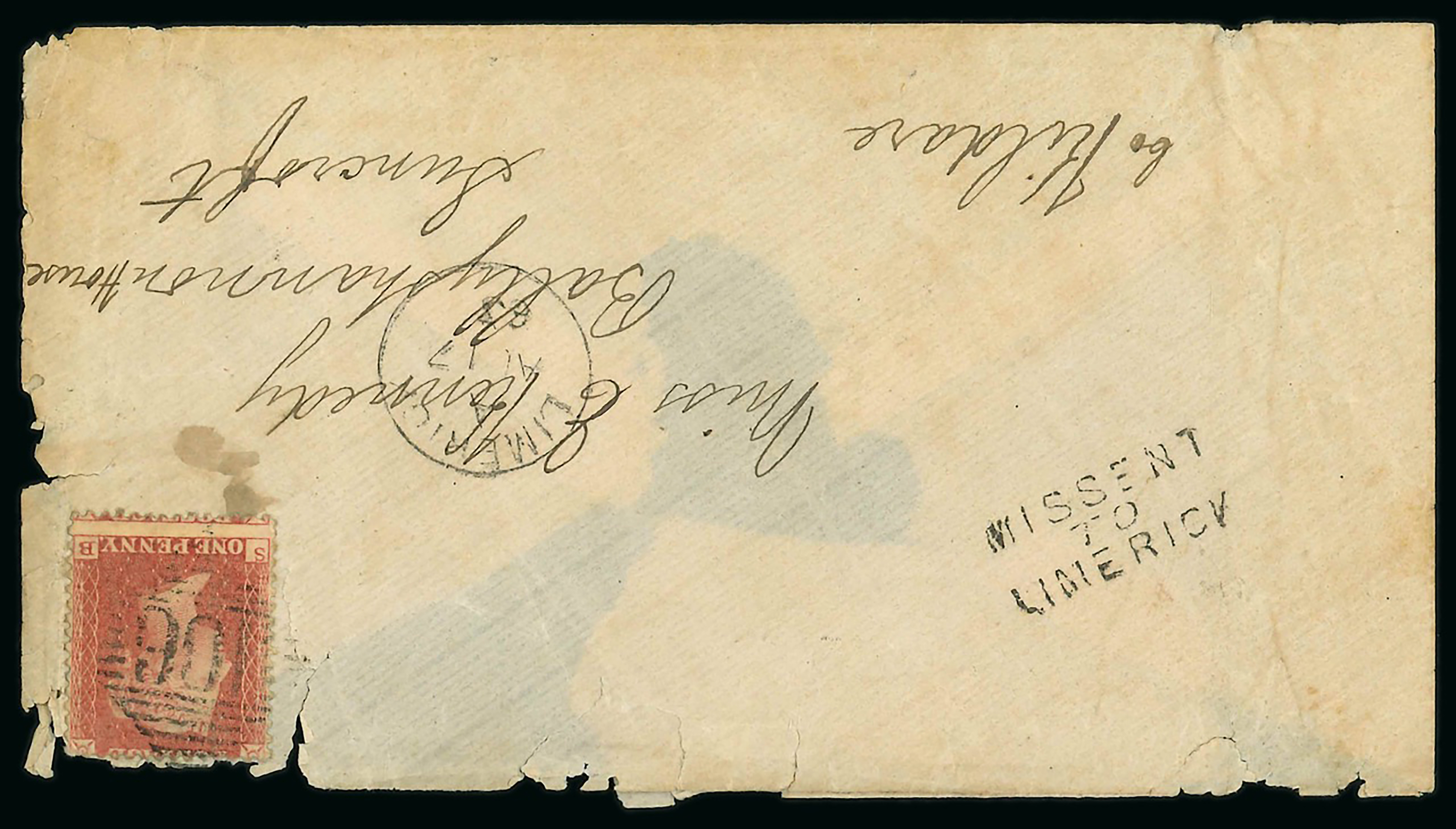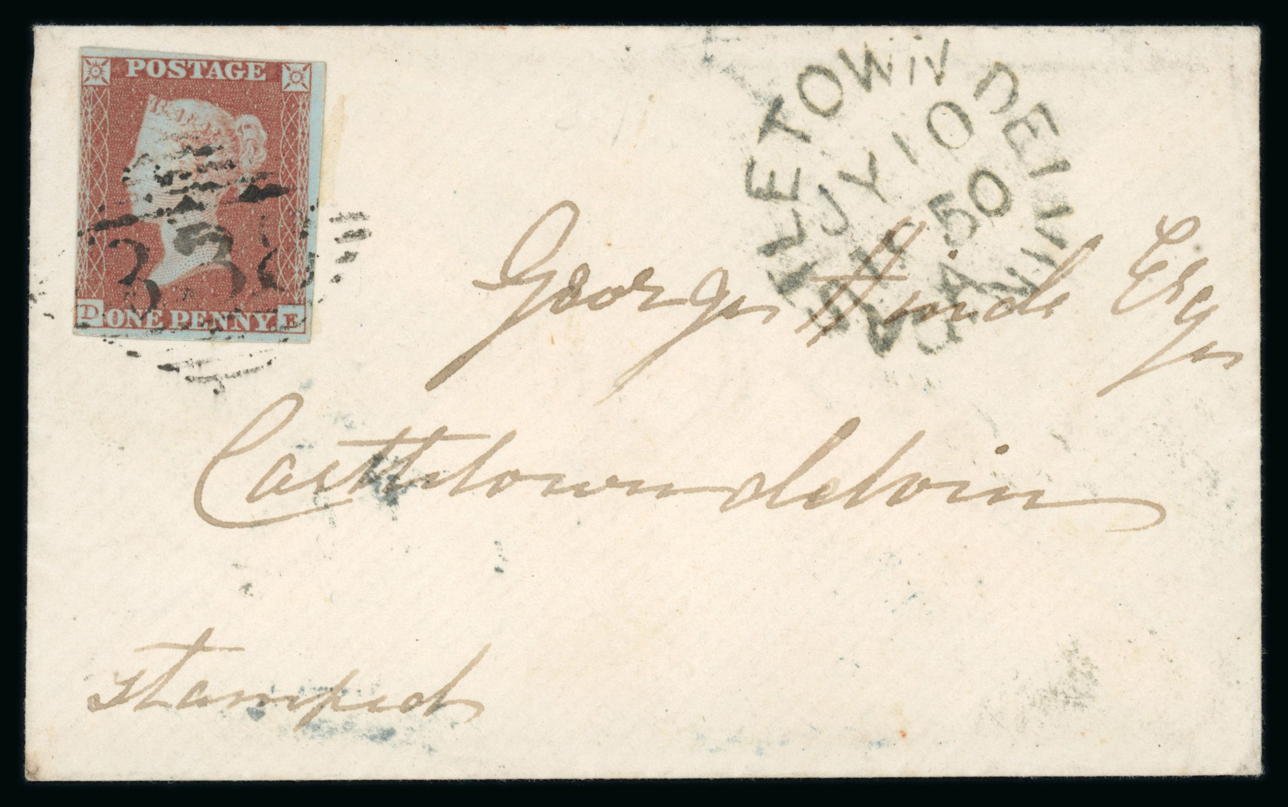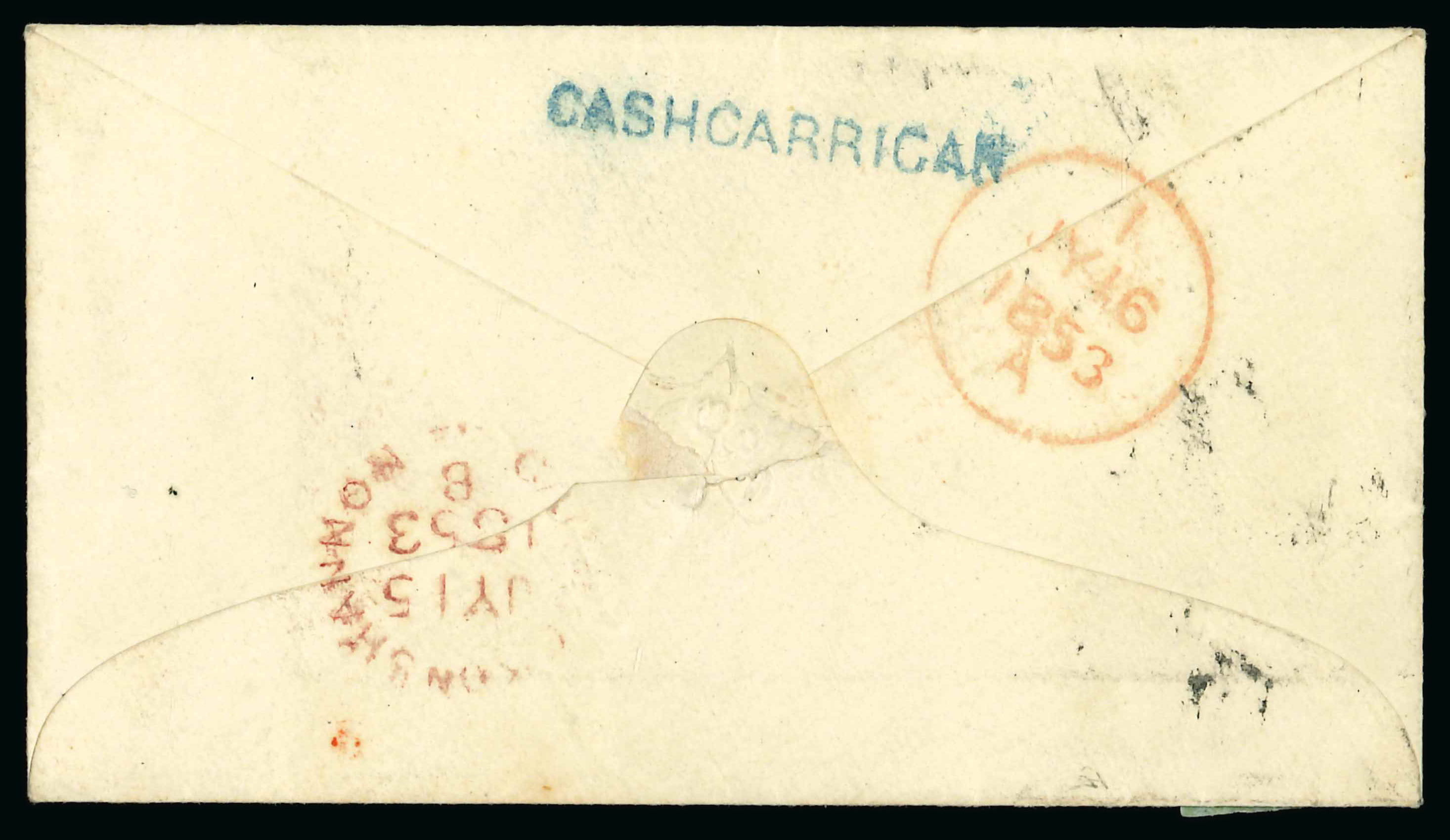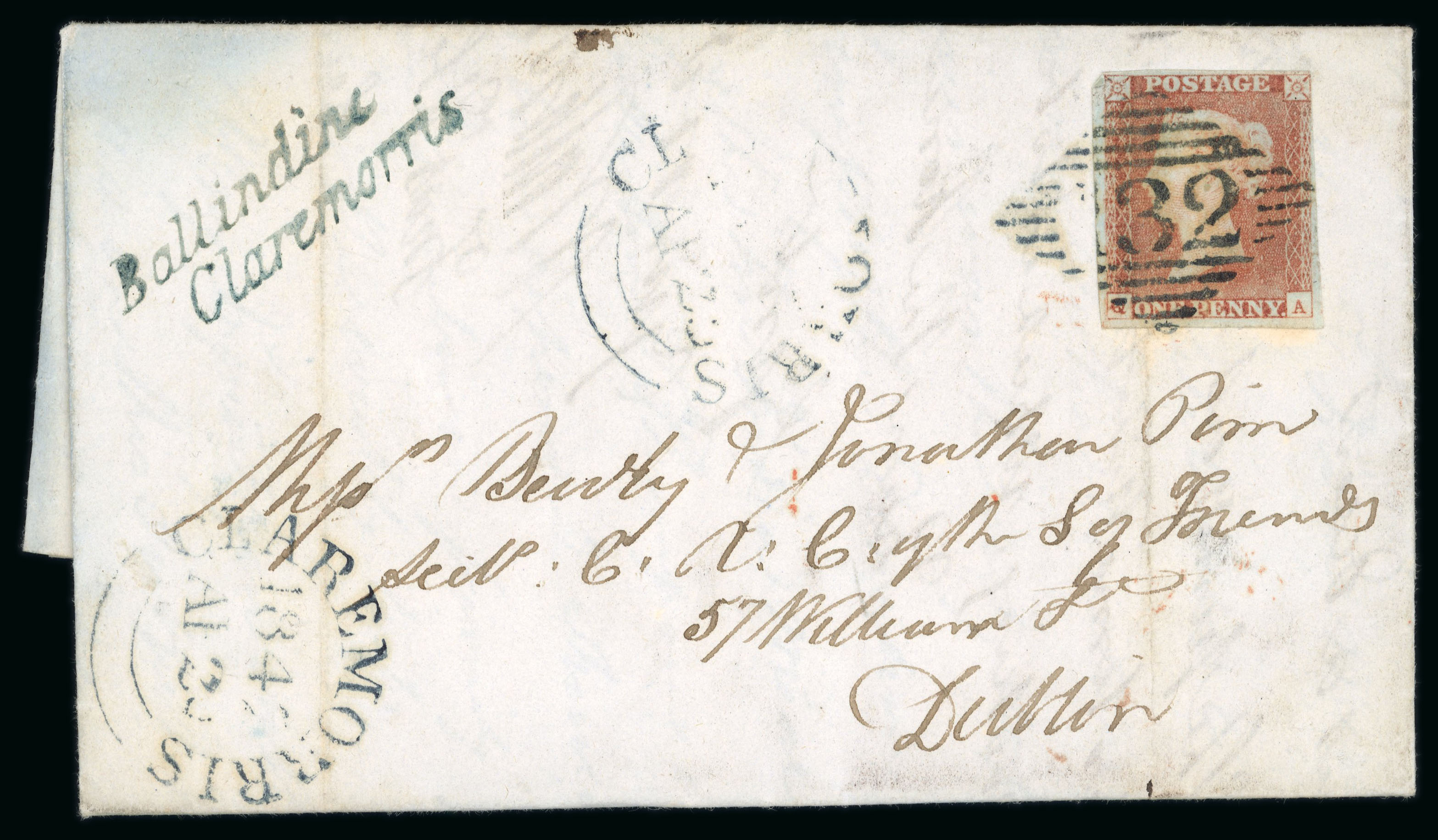 Limerick - Ardagh: 1852 Folded entire to Cornwall, franked 1841 1d red, tied by superb diamond number "353 of Newcastle West in transit, showing on reverse superb strike of the sans serif ARAGH type 2A receiver in blue, the only example
