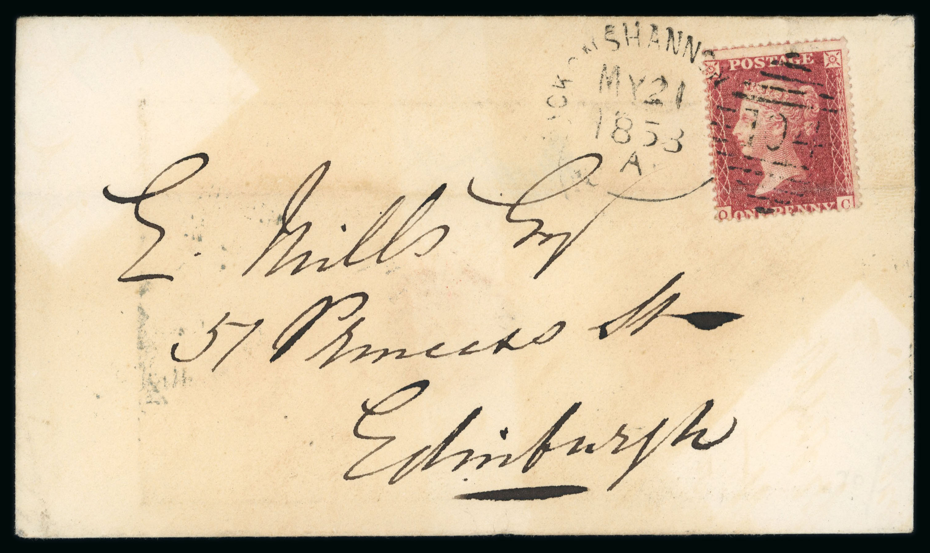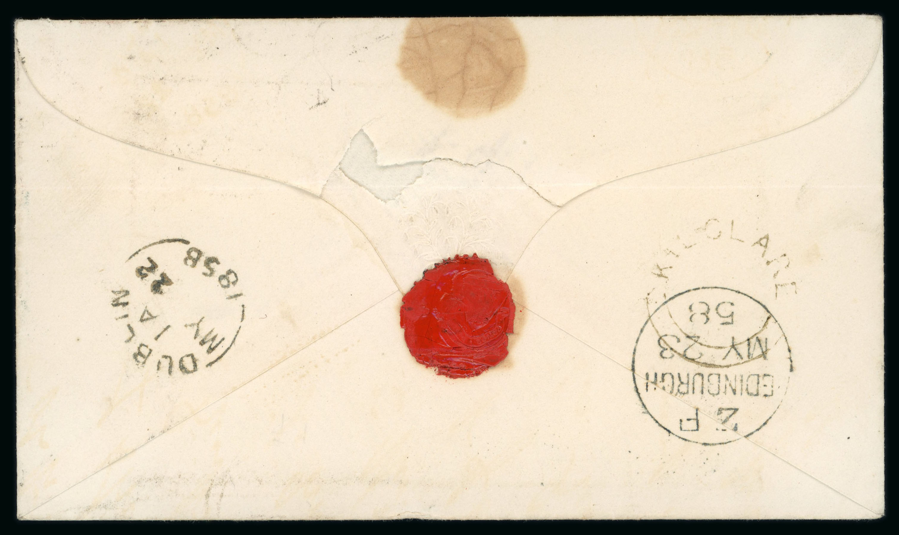 Leitrim - Kilcare: 1858 Envelope from Carrick on Shannon to Edinburgh, franked 1d red perf. 16, die II, tied by Irish type CARRICK ON SHANNON/104 spoon datestamp, backed stamped by the little-known undated circular sans serif KILCLARE