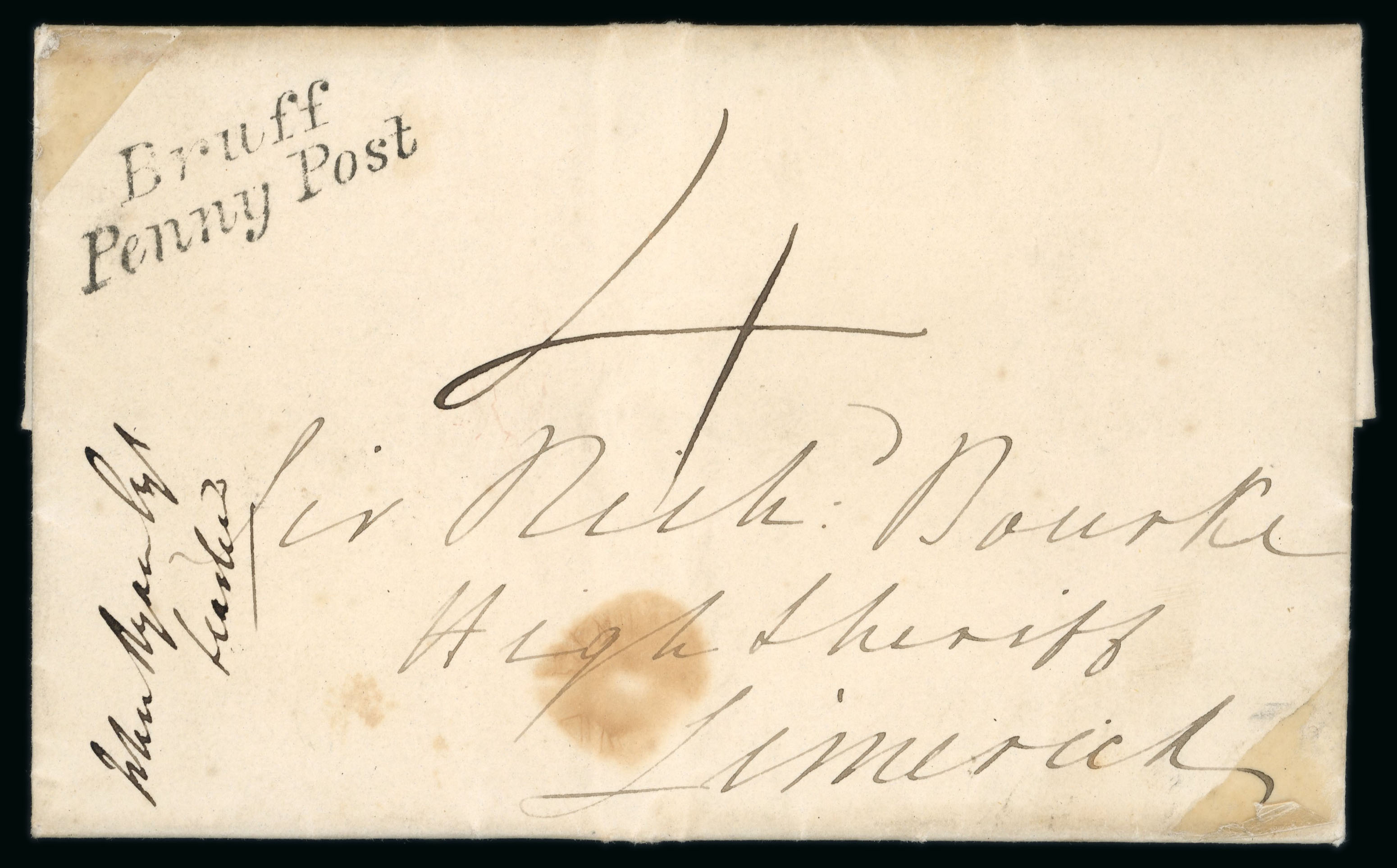 black (2), Pallaskenry/Limerick, boxed mkgs of PAID AT/BRUFF in black and red, etc., all strikes are fair to very fine, a scarce group (55) (Image 1)
