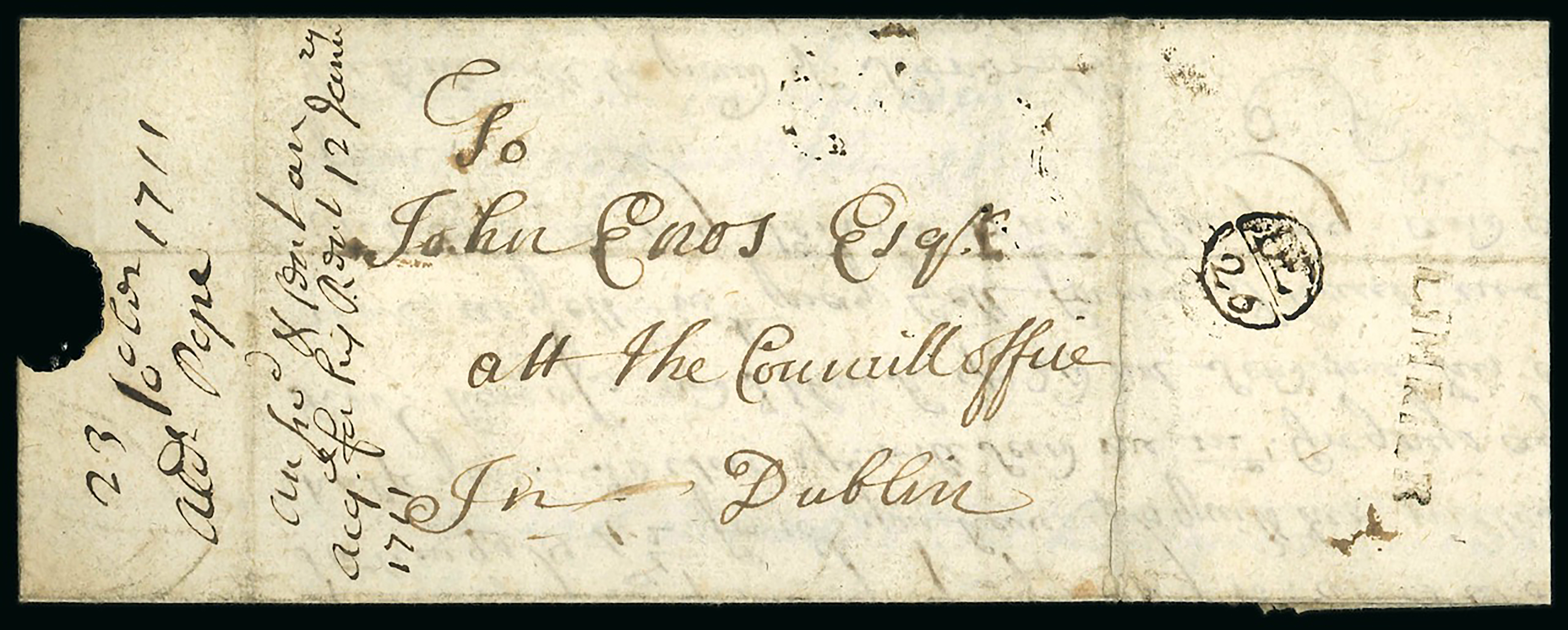 and one in red, including very early mkg on 1711 cover, LIMERICK/PENNY POST in black, linear sans serif 3-line MISSENT/TO/LIMERICK, mileage mkgs of LIMERICK/94 in red (4), LIMERICK/94 circular datestamps in red (4), italic mkg of Limerick/Penny Post