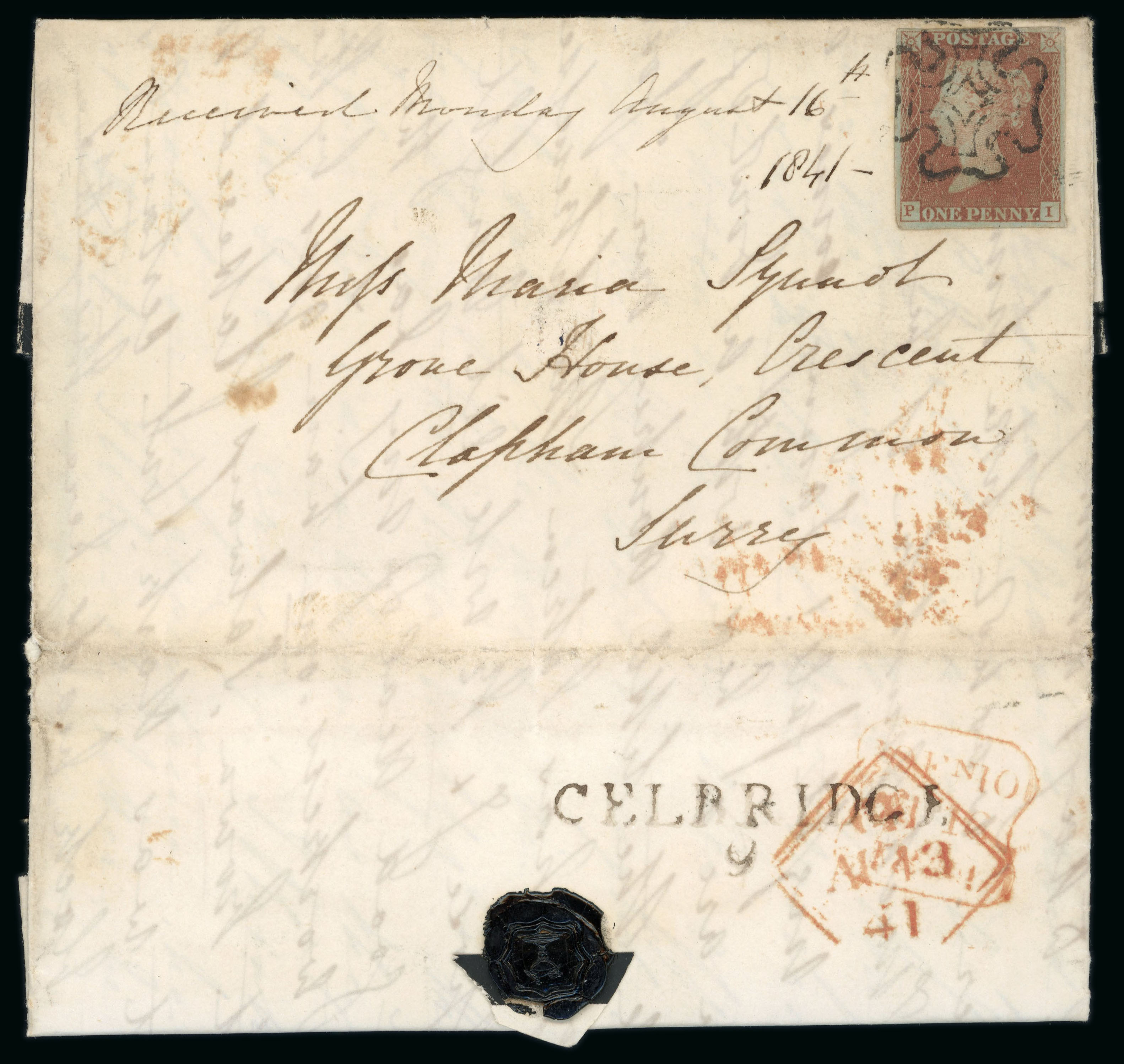 Kildare - Celbridge: 1841 Folded envelope to Clapham Common, franked 1841 1d red, PI, plate 8 from the Black plate, four clear margins tied clear complete MC in black, with CELBRIDGE/9 and Dublin diamond ds on back flap, an attractive