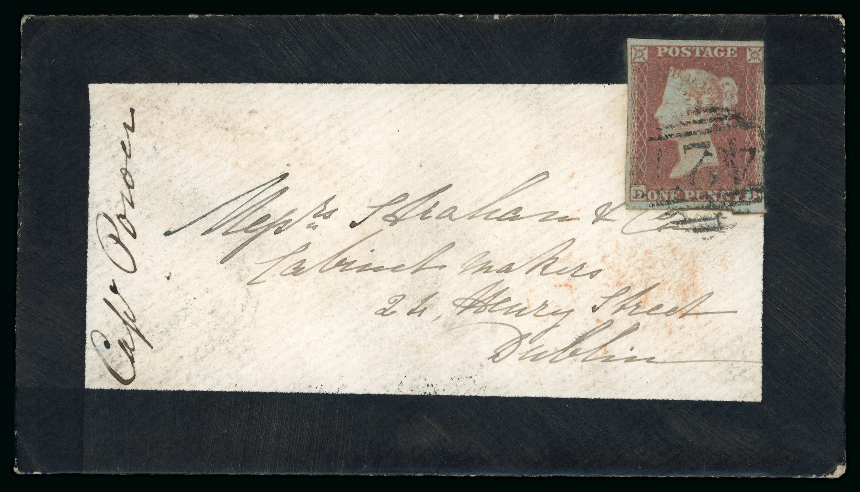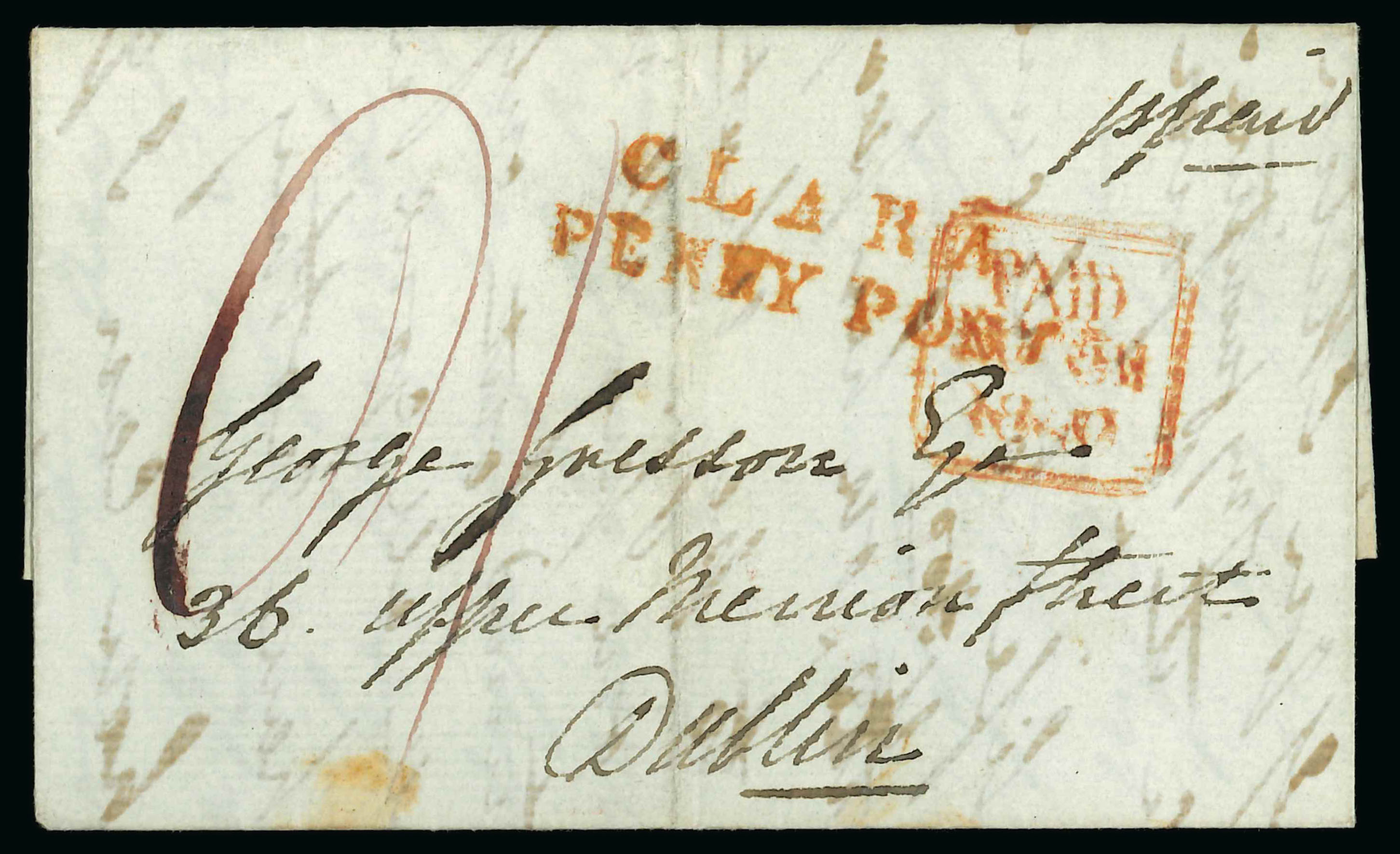 Offaly - Clara: 1832-49 Selection of ten covers mounted on album pages, showing CLARA linear in black (4), CLARA/PENNY POST in black, red (2) and blue (3) etc., all strikes are fair to fine (10) (Image 1)