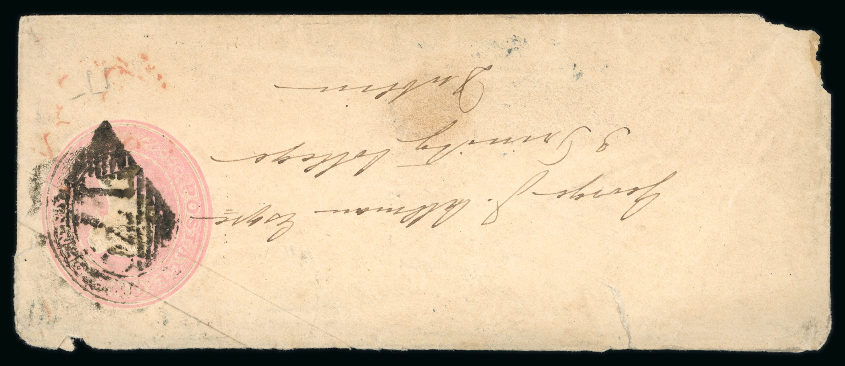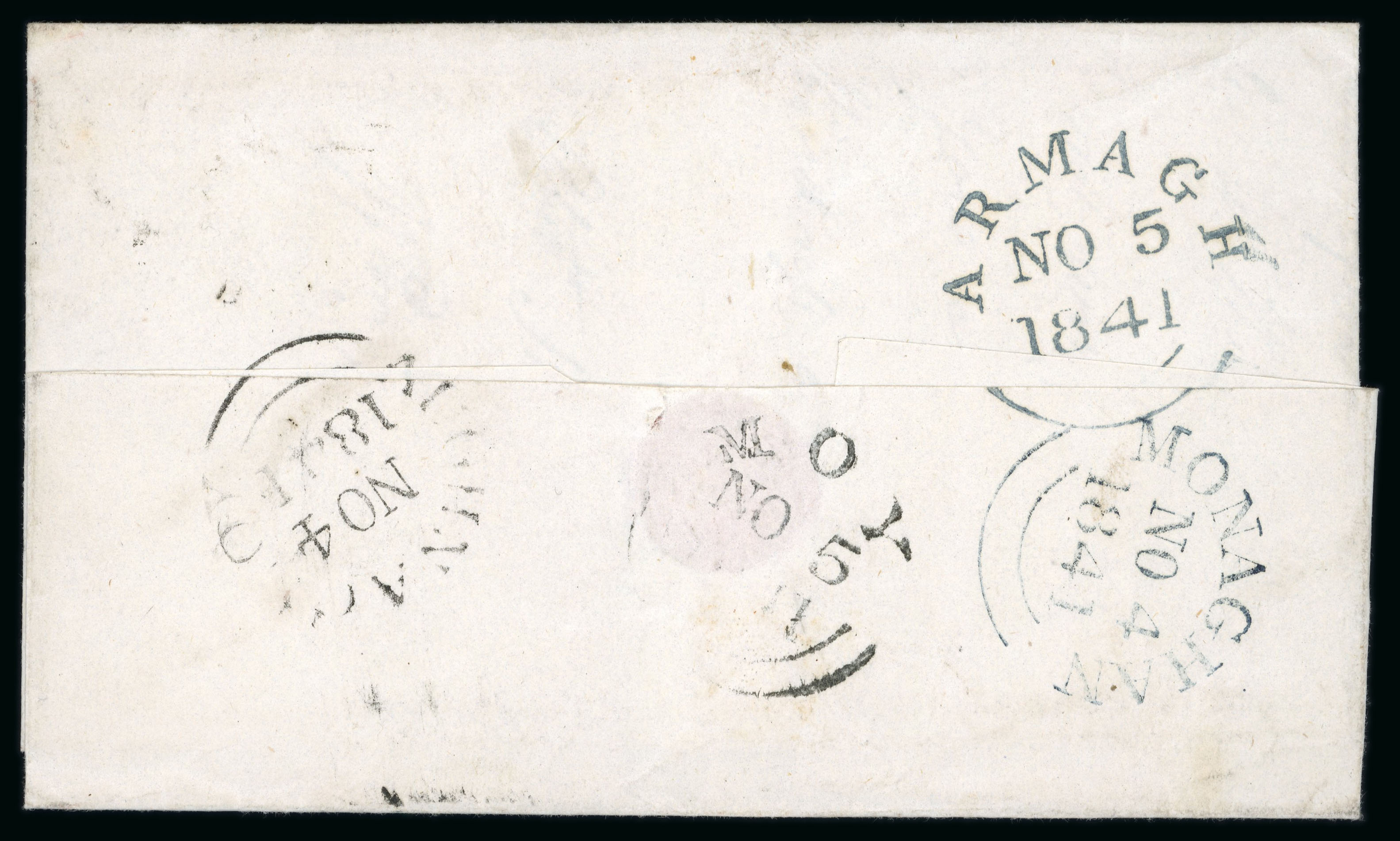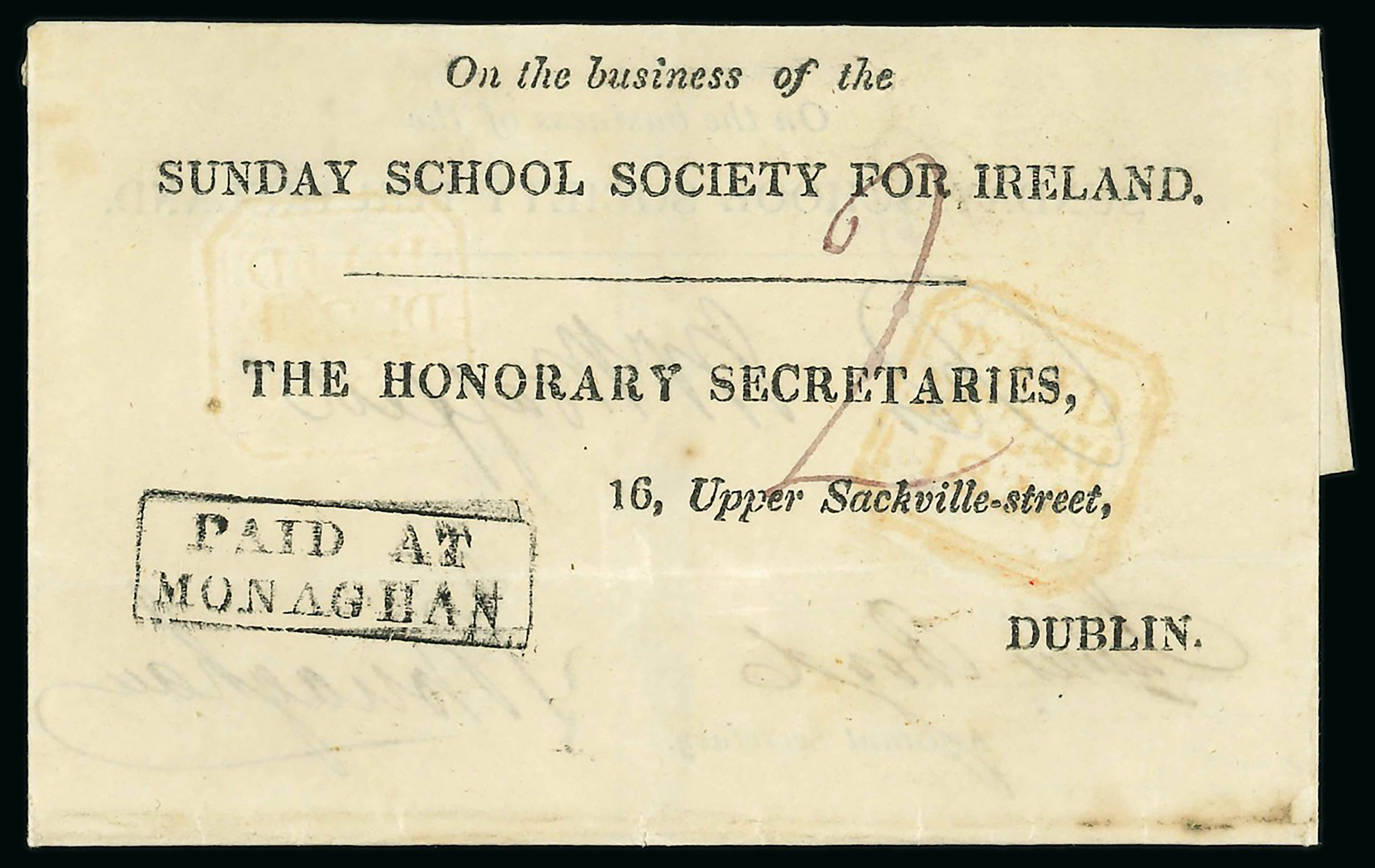 mkg, MONAGHAN/66 mileage mkg in black and red, italic boxed Monaghan/Penny Post in red, PAID AT MONAGHAN in red and black (3) one mkg on SUNDAY SCHOOL SOCIETY FOR IRELAND printed entire etc., all strikes are fair to very fine, a scarce group (8) (Image 1)