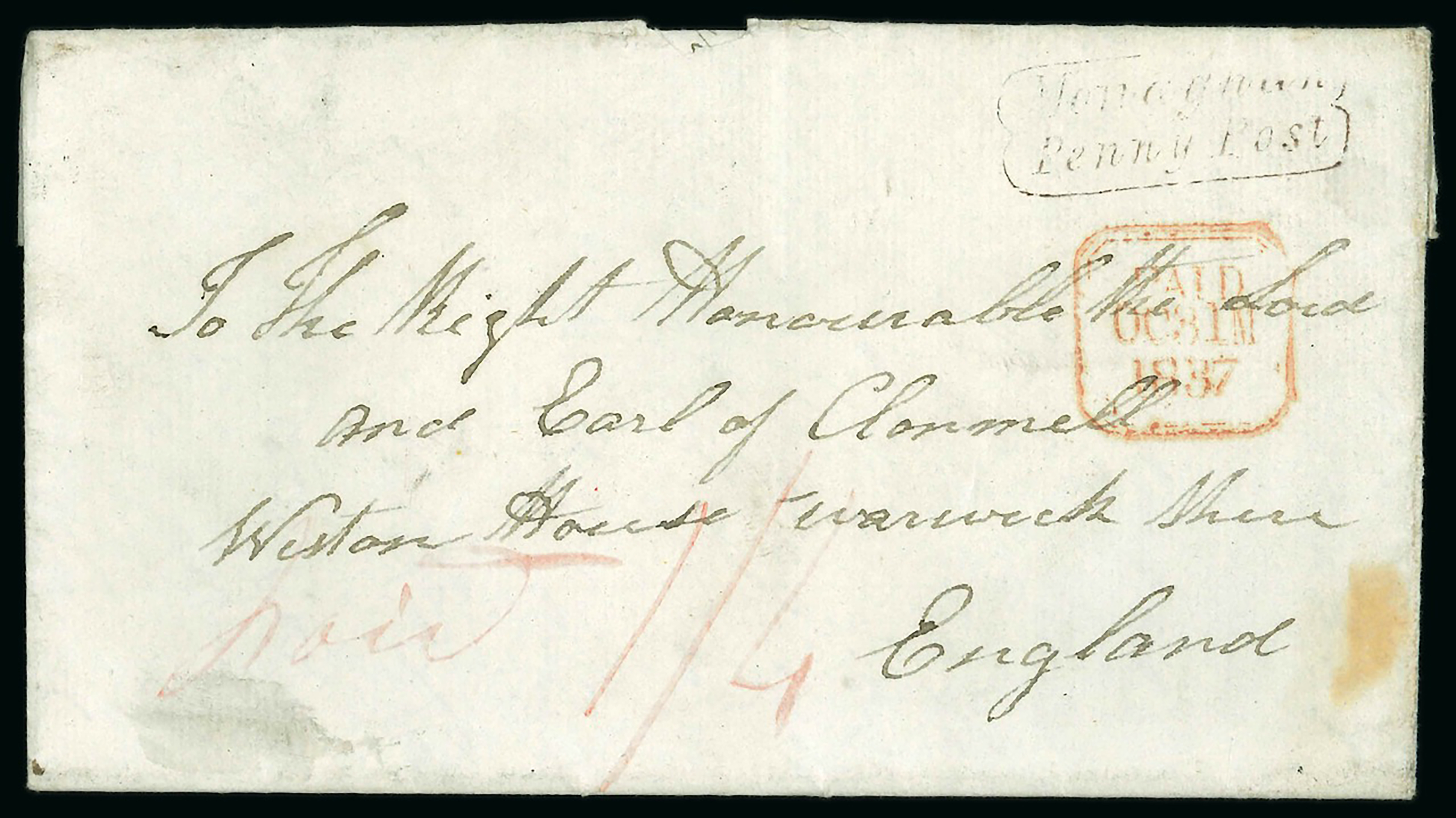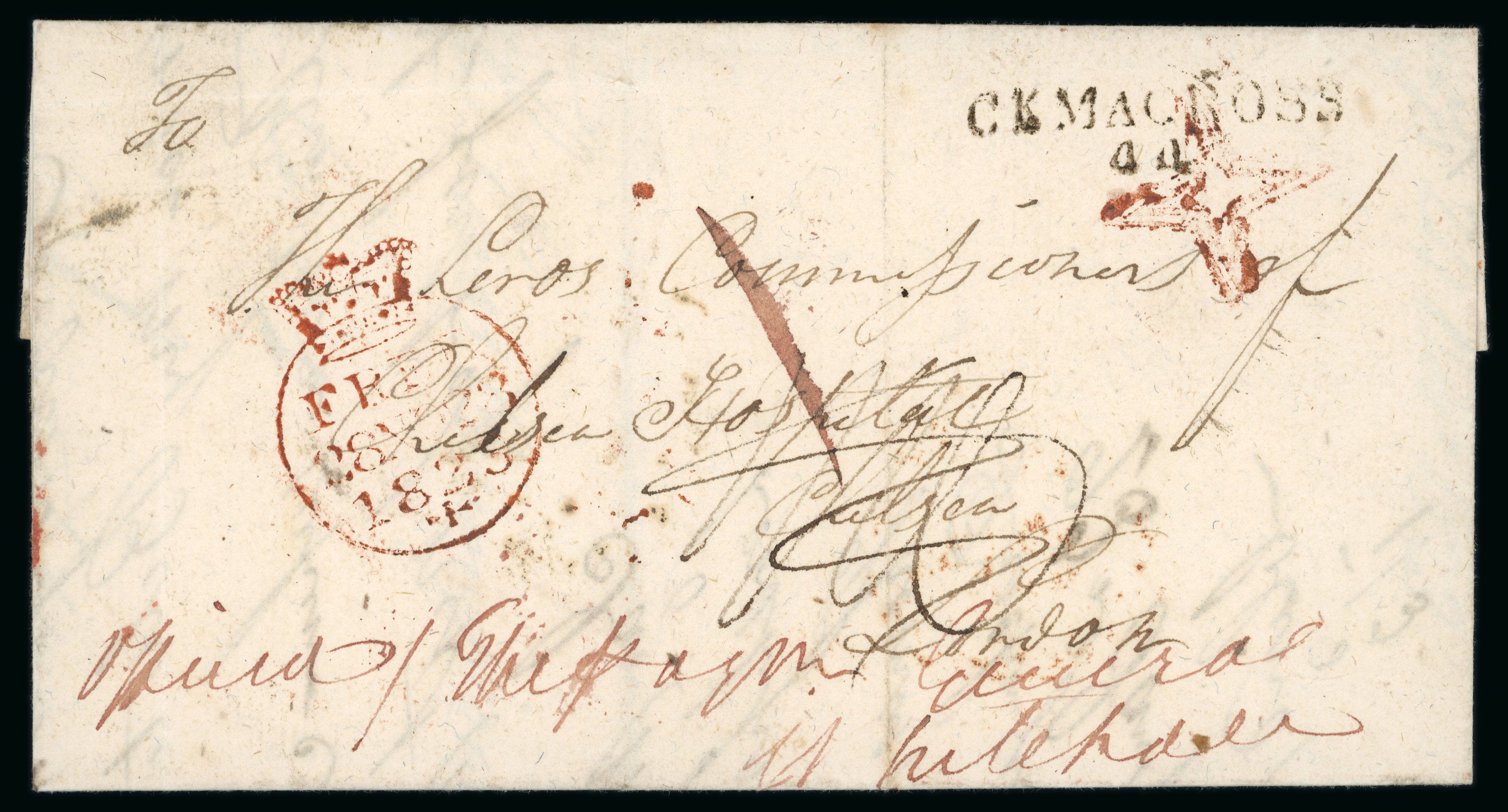 linear sans serif 3-line MISSENT/TO/LIMERICK, mileage mkg large type BOYLE/85 in red (4), smaller type BOYLE/84 in red (4), italic mkg of Boyle/Penny Post in black, boxed mkg of PAID AT/BOYLE in red, etc., all strikes are fair to very fine, a