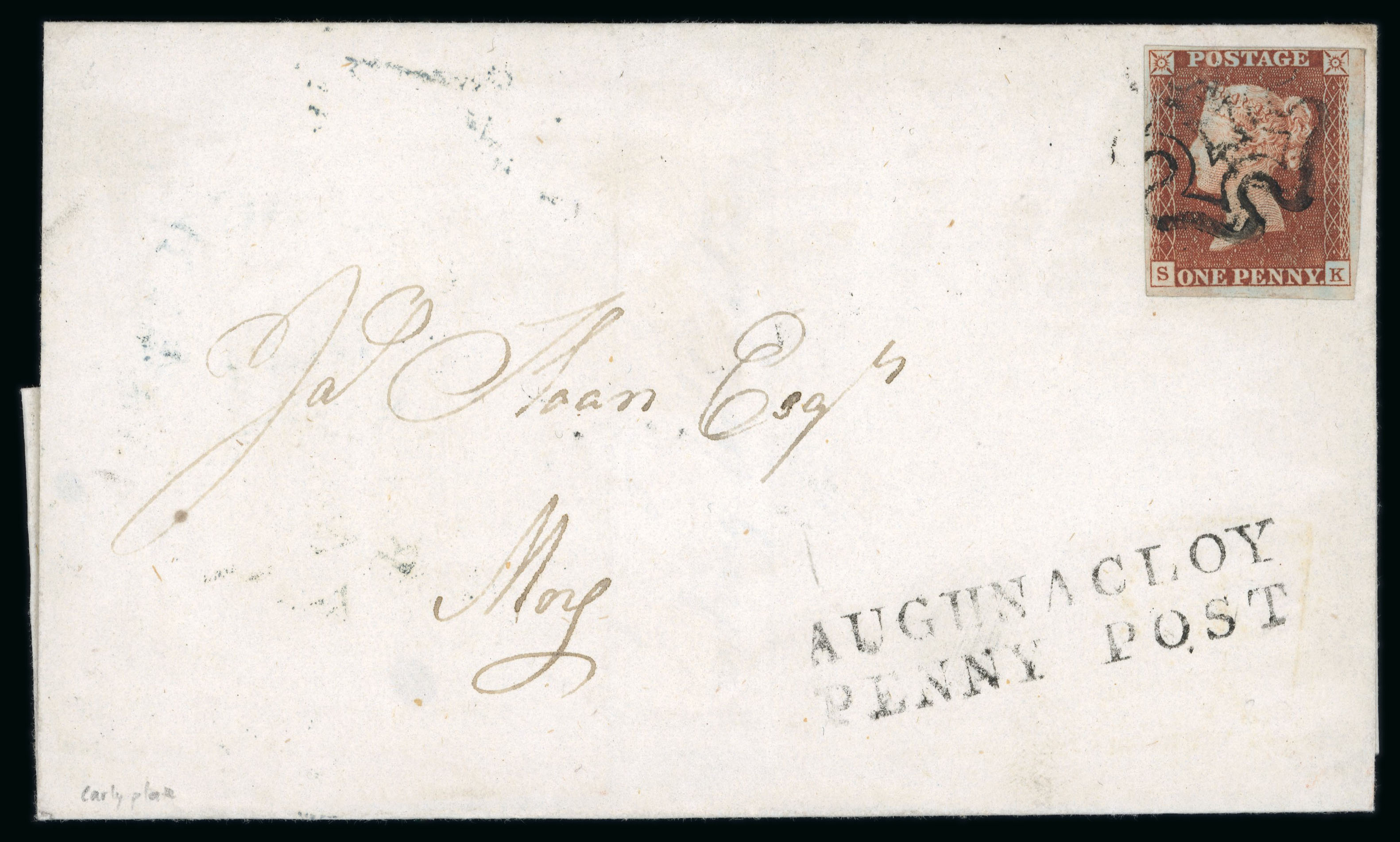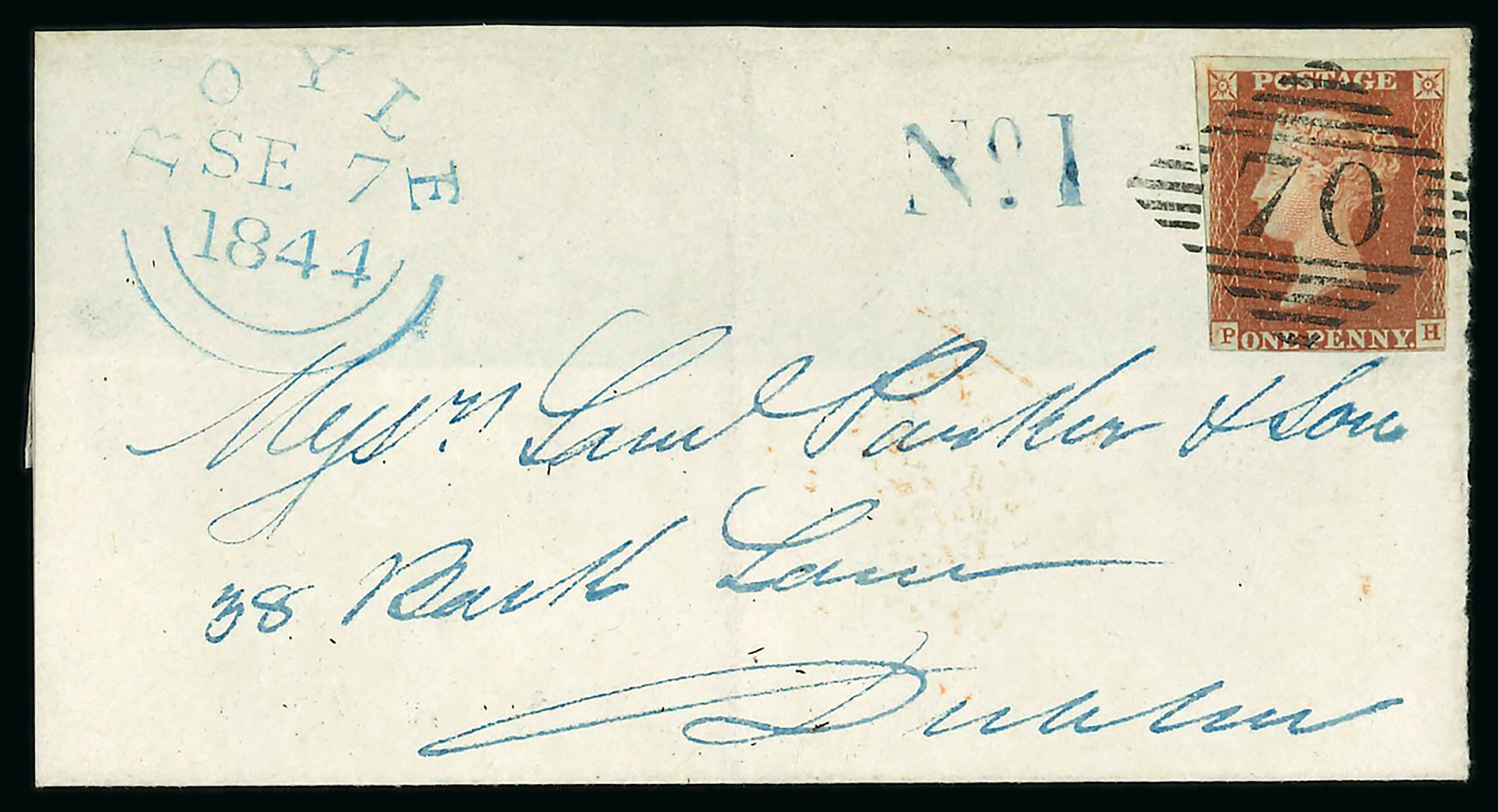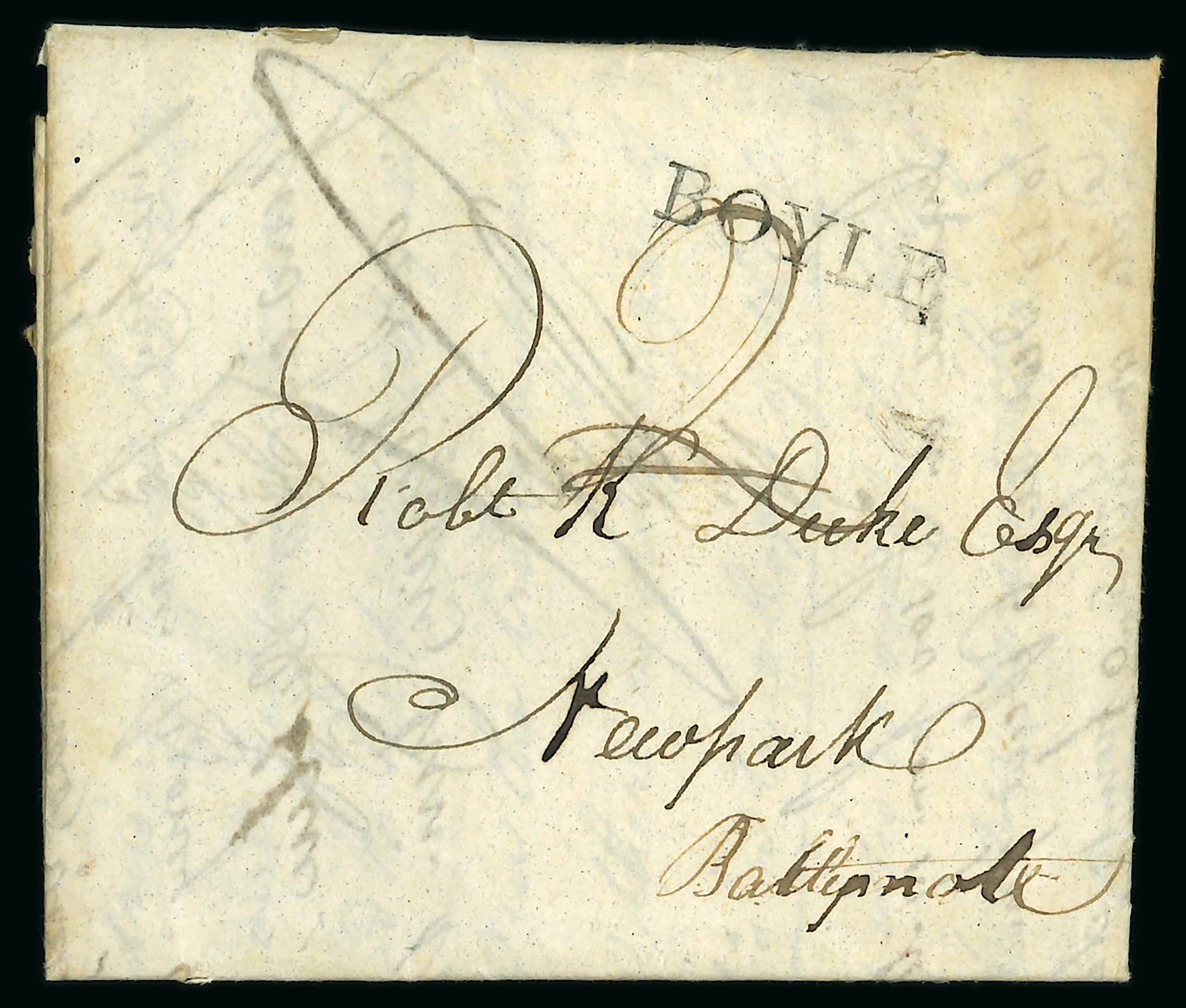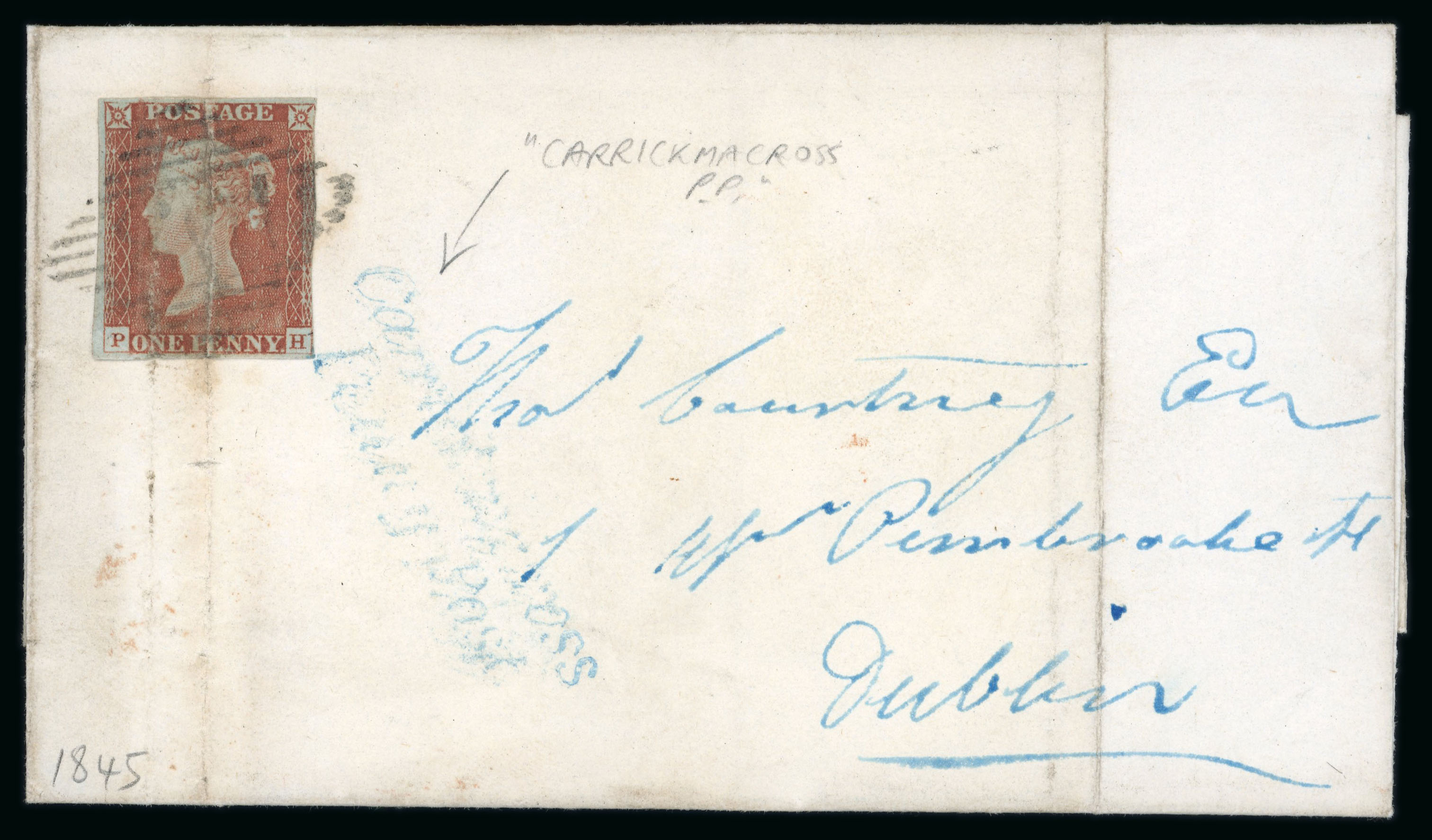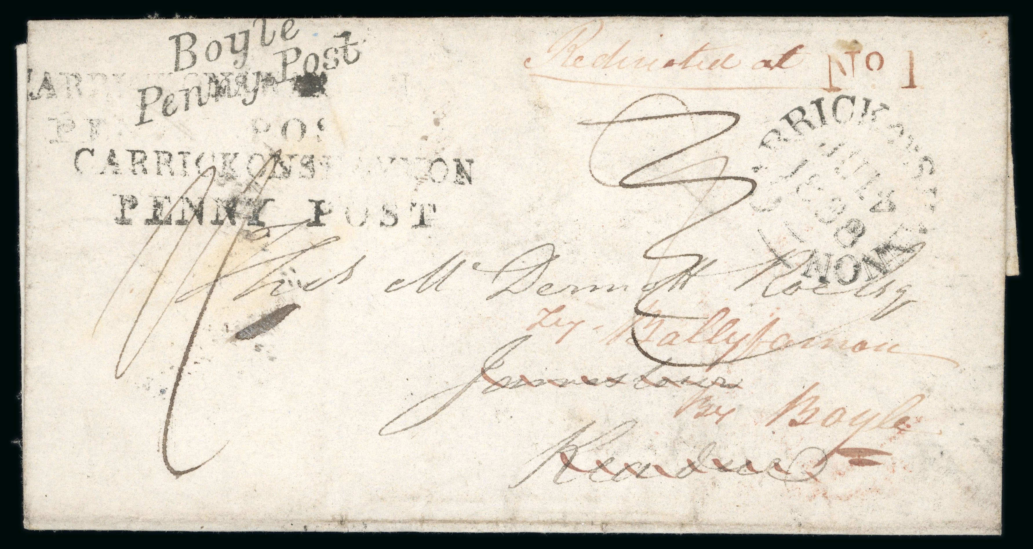 Roscommon - Boyle: 1838 Folded cover to Keadue, redirected to Ballyfarnan by Boyle, showing italic Boyle/Penny Post and CARRICK ON SHANNON/PENNY POST both in black and "No.1" alongside, unusual and scarce combination of Penny Post hs. (Image 1)